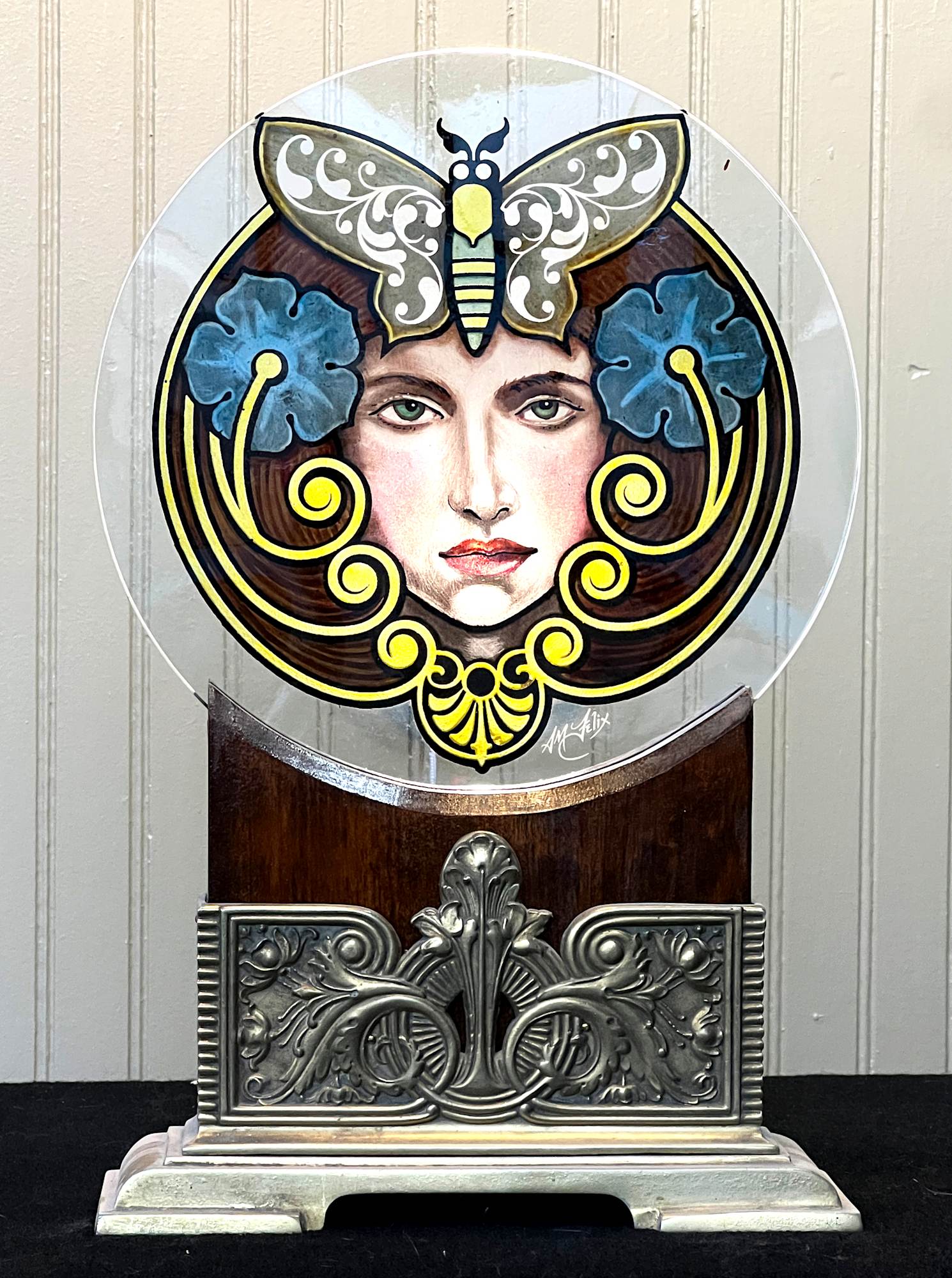 Fire painted glass circle, in a bespoke standing frame with antique brass architectural ornament.