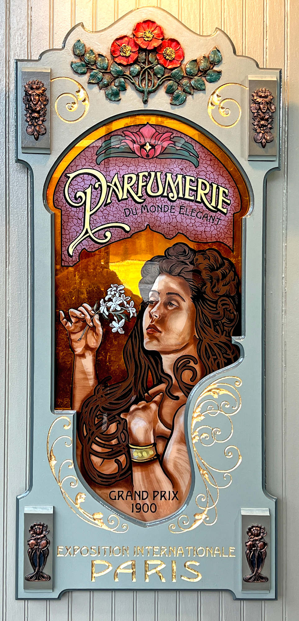 Verre Eglomise: Reverse painted glass with gold leaf. Set in a bespoke wood frame with architectural embellishments. Inspired by the French Art Nouveau Era.