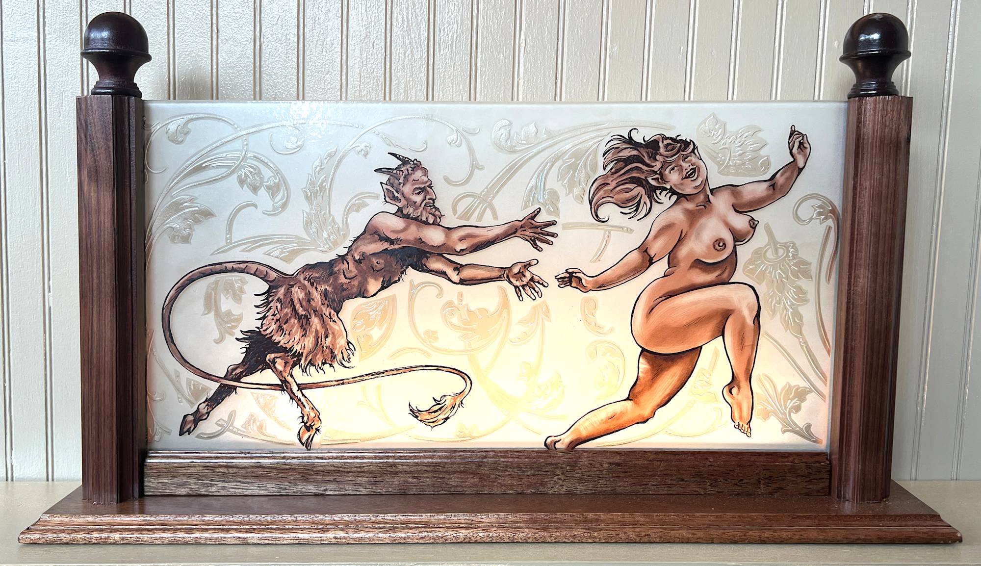 Carved & etched glass panel. Fire painted with traditional stained glass paints.