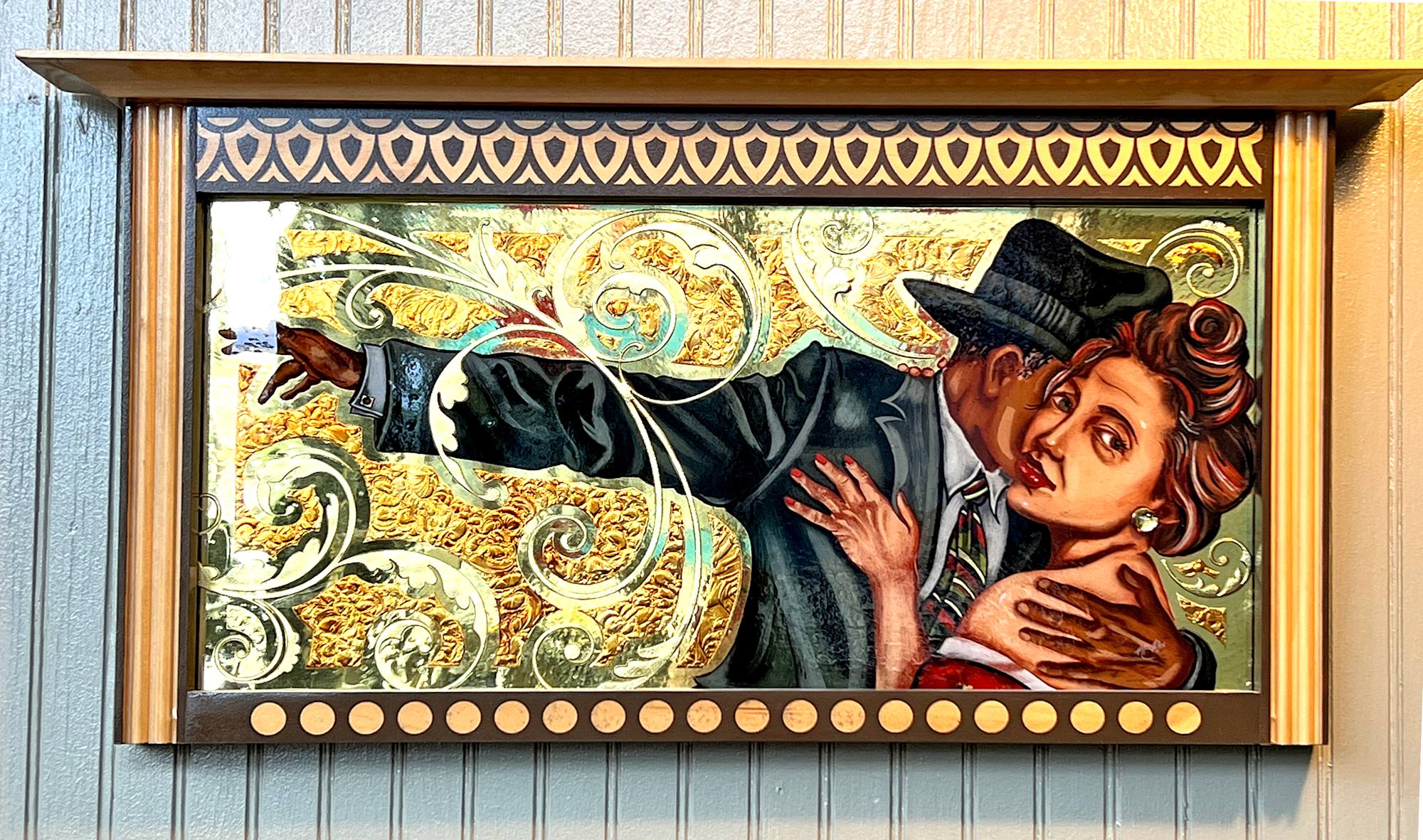 Glass is blast carved and glue chip textured, then painted and gilded. Made with a bespoke painted ornamental wood frame.