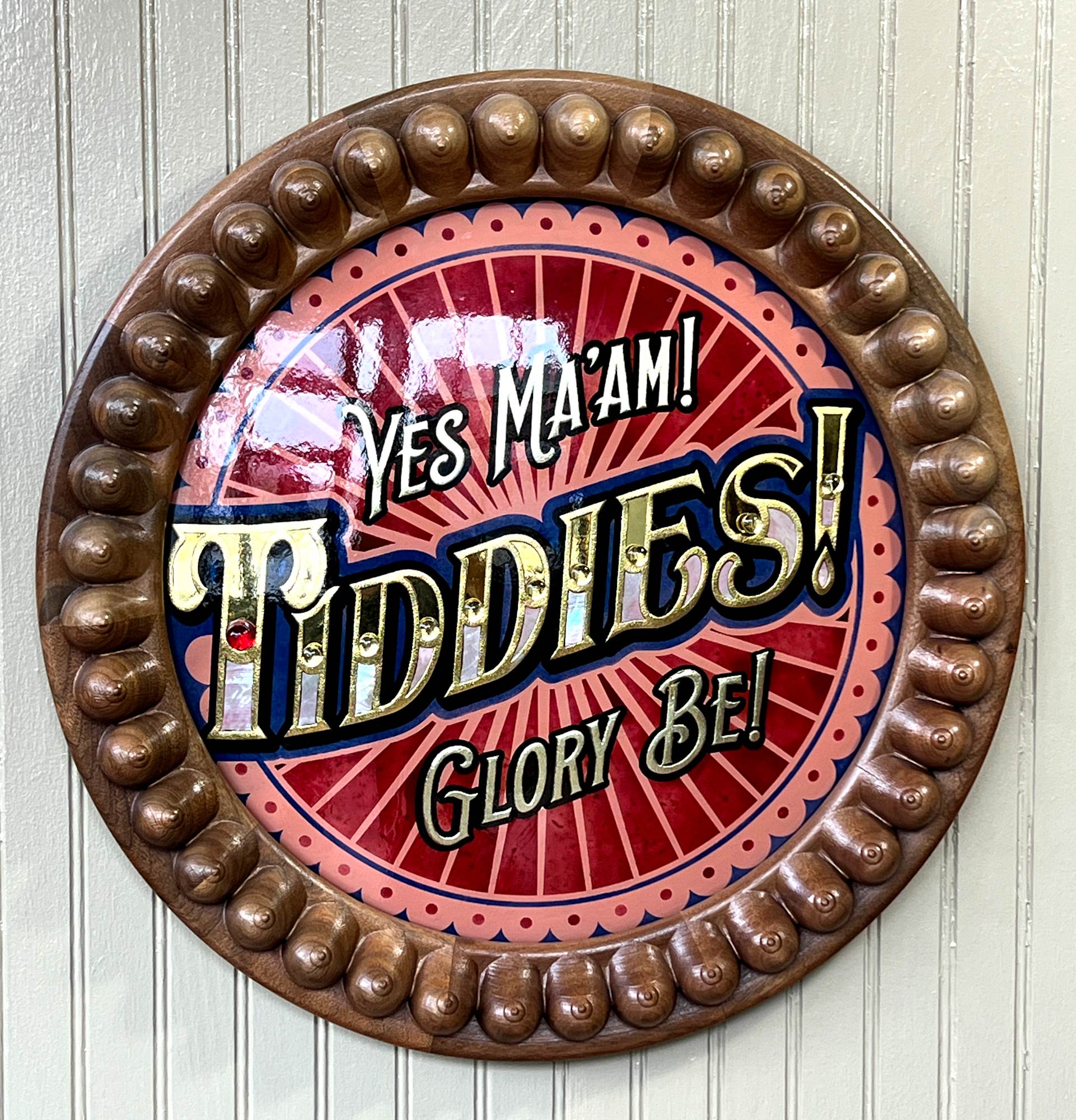 This glass is etched and slumped, fire painted and gilded with 23k gold leaf. Set in a CNC carved bespoke walnut frame.
