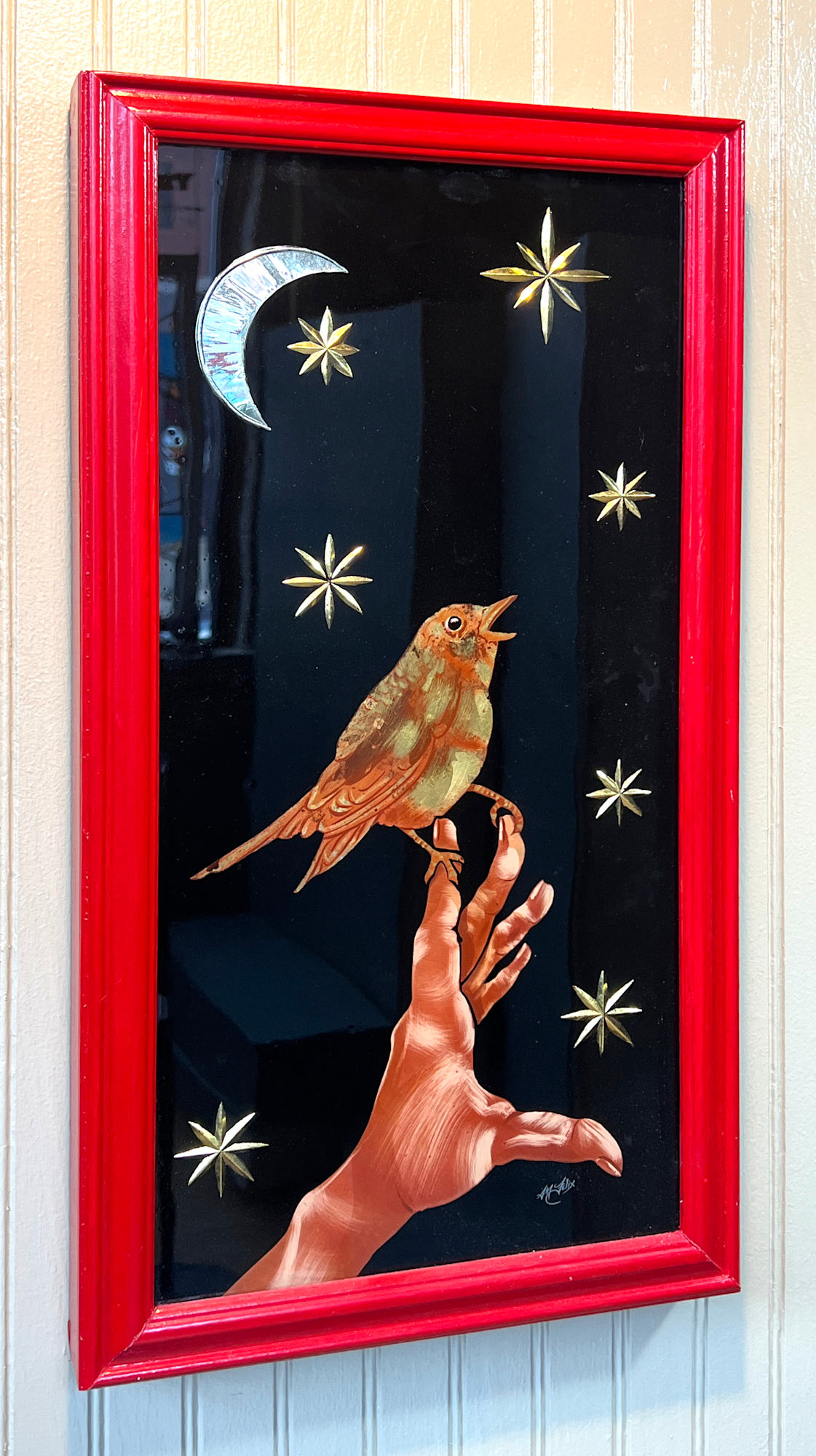 Glass is wheel engraved, gilded, and fire painted with traditional stained glass paints. Painted wood bespoke frame.