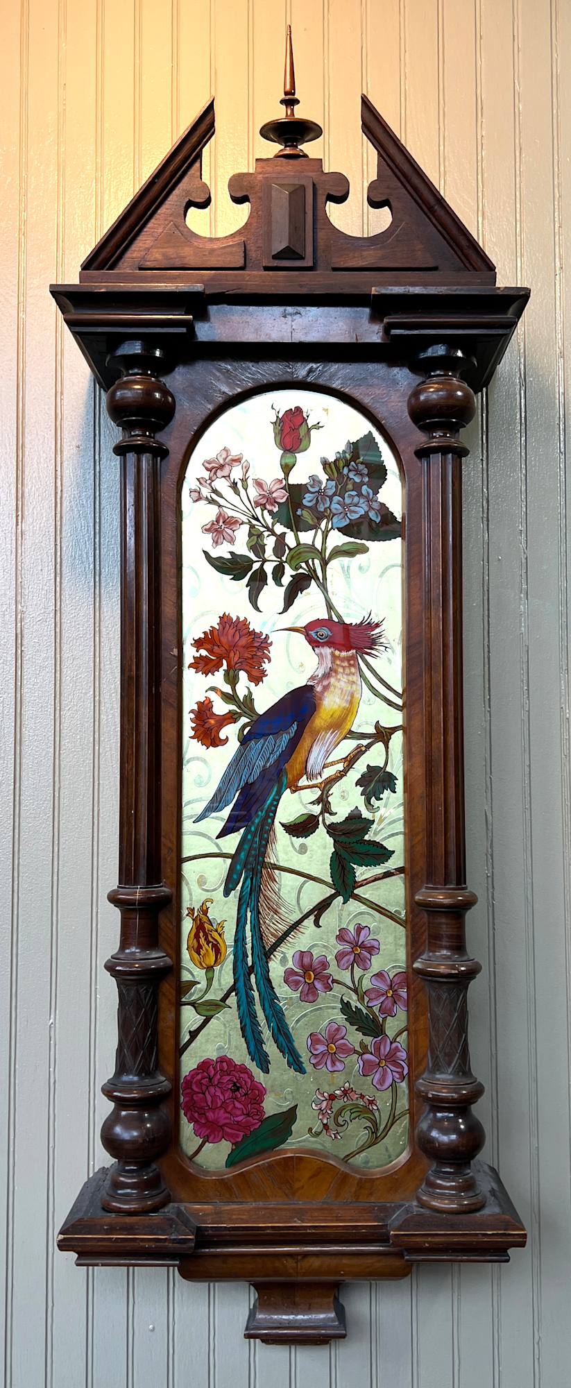 Verre Eglomise: Reverse painted glass. Gilded with 23k gold leaf. Placed in an antique 19th century German clock cabinet.