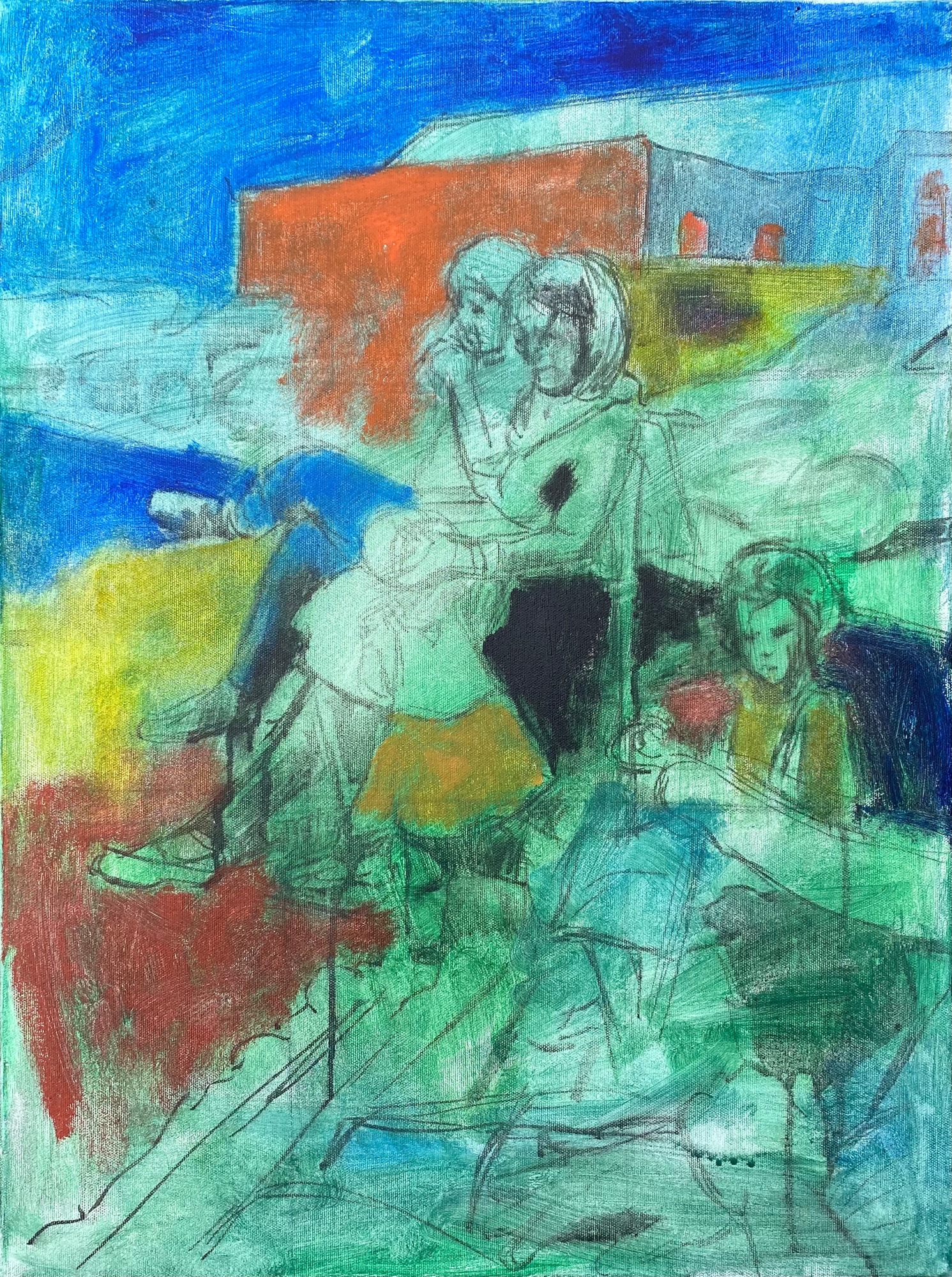 During the Covid 19 lock downs while church services were held outside in the pecan grove, I did many different compositions of parishioners worshipping in lawn chairs. This is one of those paintings.