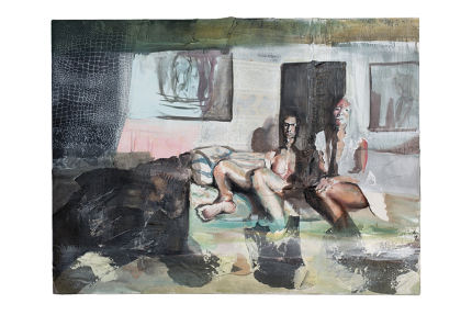 There is a partiular magnetic pull towards materiality. I tend to hold on to things that others might throw away, creating works from everything from my kid's outgrown clothes to non-decomposing plastic bags. When seeing the fabric, the psychedelic swirls juxtaposed with the furry beige toilet seat cover I threw away last year, the mediums sing, complementing one another. Pile of wine bottles suffocate my studio waiting to be smashed and transformed. Transparent champagne tulle left over from my handmade wedding dress is intertwined with plastic bags in waves of associative impluse When constructing paintings, I overlay fabric swatches, painting in lucid brushstrokes, giving the material a chance to breath.