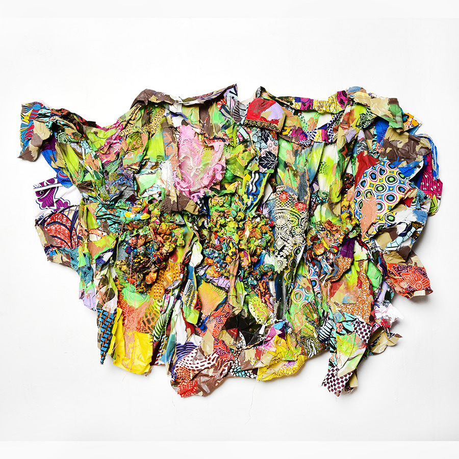 His work is concerned with the Black American vernacular experience. The work entails collecting found materials, Georgia red clay, and Dutch Wax cloth, by creating a conversation between family, tradition, the spiritual and material relationship between Africa and the South. My process is influenced by the way Hip Hop gathers different cultures through sampling and is charged with energy channeled and passed through the Pan African lineage. The work is inspired by the Great Migration of Black Americans who left the familiar in the hope of something better. Along with the fabric, their is diversity of the paints applied to the surface. House paint, spray paint and the red Georgia clay are as important as the more traditional acrylics. This democracy of materials is crucial to the work that honors the resourcefulness of African Americans. House paint this is not the right shade ends up in a corner of rejects. Mining through a stack of paint cans, I search for that thick odd color. Something that was unwanted, now is able to bring a patch of color and texture to an object that was otherwise flat. Wax Cloth is still visible, equal to the paint and other materials and added to the surface. Pouches are not greater than the knots, glyphs not greater than the clay. They are seen together as a whole and still maintain their individuality. Draping the fabric is a mechanism that infuses ephemerality, while creating shape, and allows movement, inviting the viewer on a journey