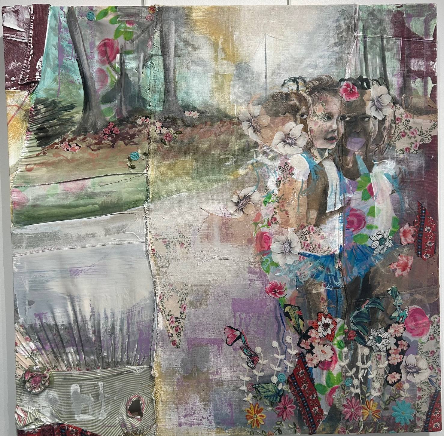 There is a partiular magnetic pull towards materiality. I tend to hold on to things that others might throw away, creating works from everything from my kid's outgrown clothes to non-decomposing plastic bags. When seeing the fabric, the psychedelic swirls juxtaposed with the furry beige toilet seat cover I threw away last year, the mediums sing, complementing one another. Pile of wine bottles suffocate my studio waiting to be smashed and transformed. Transparent champagne tulle left over from my handmade wedding dress is intertwined with plastic bags in waves of associative impluse When constructing paintings, I overlay fabric swatches, painting in lucid brushstrokes, giving the material a chance to breath.