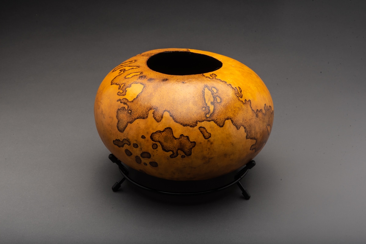 - Gourd, pyrography, dye, wood stain. Black metal stand.