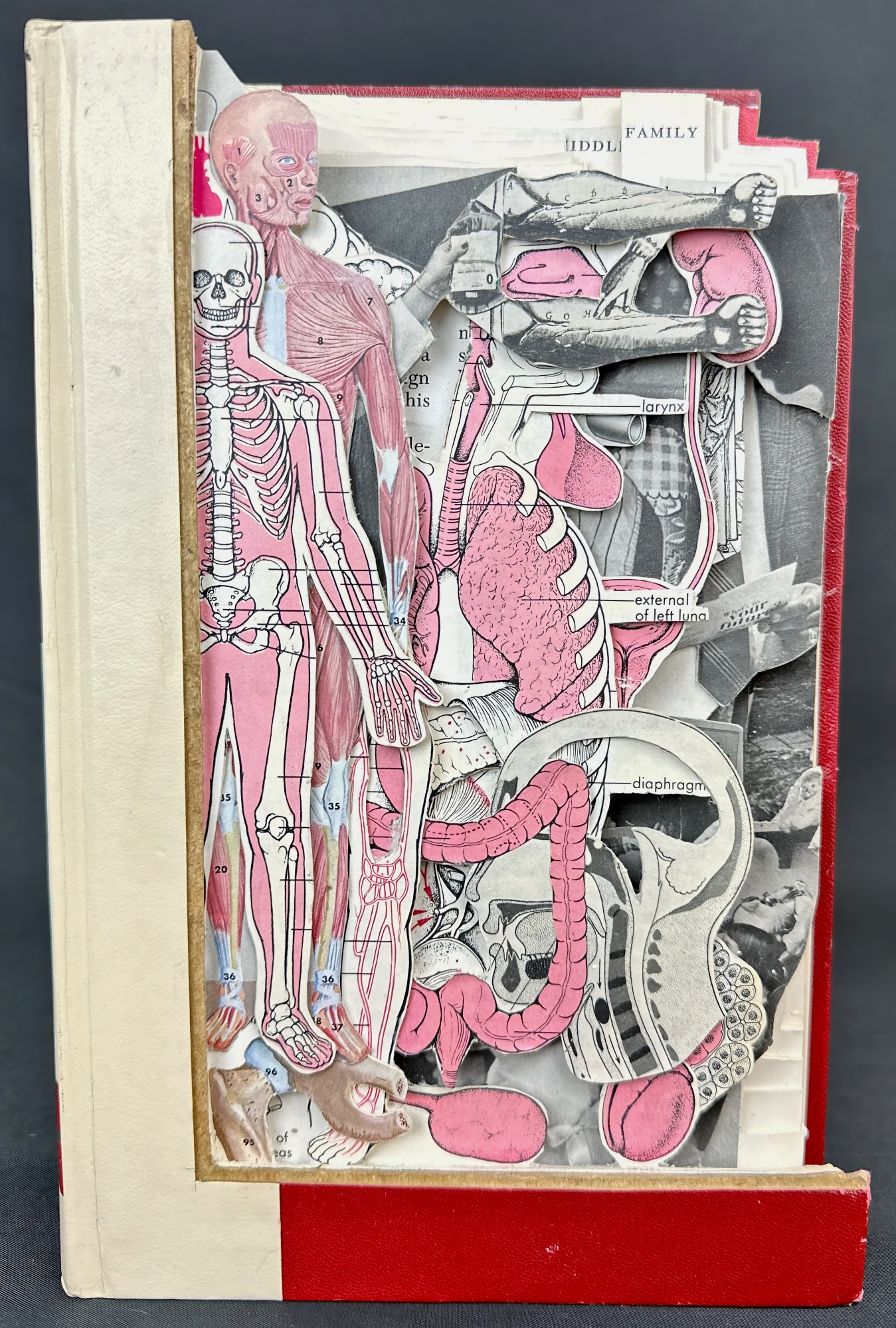 Medical in Pink is derived from an old Medical & Health encyclopedia from the 50's. The entire collection was printed in single Pantone pink making the human body elements pop. Captured here in a simple reveal, the red and pink stand out.