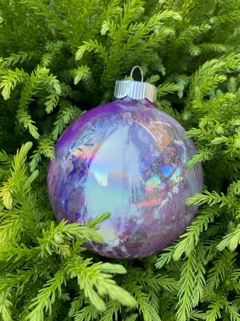 These 4" glass ornaments are unique creations straight from my heart! They are hand designed from the inside out, one drop of paint at a time, creating beautiful surprises from every view. Perfect keepsakes for collecting or sharing... Bringing blessings of love and joy every time you see it.