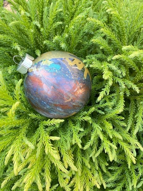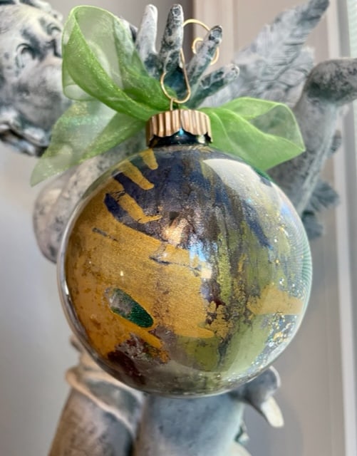 Green glitter, earthy tones of purple and copper and gold...female figure emerged here w lots of hearts