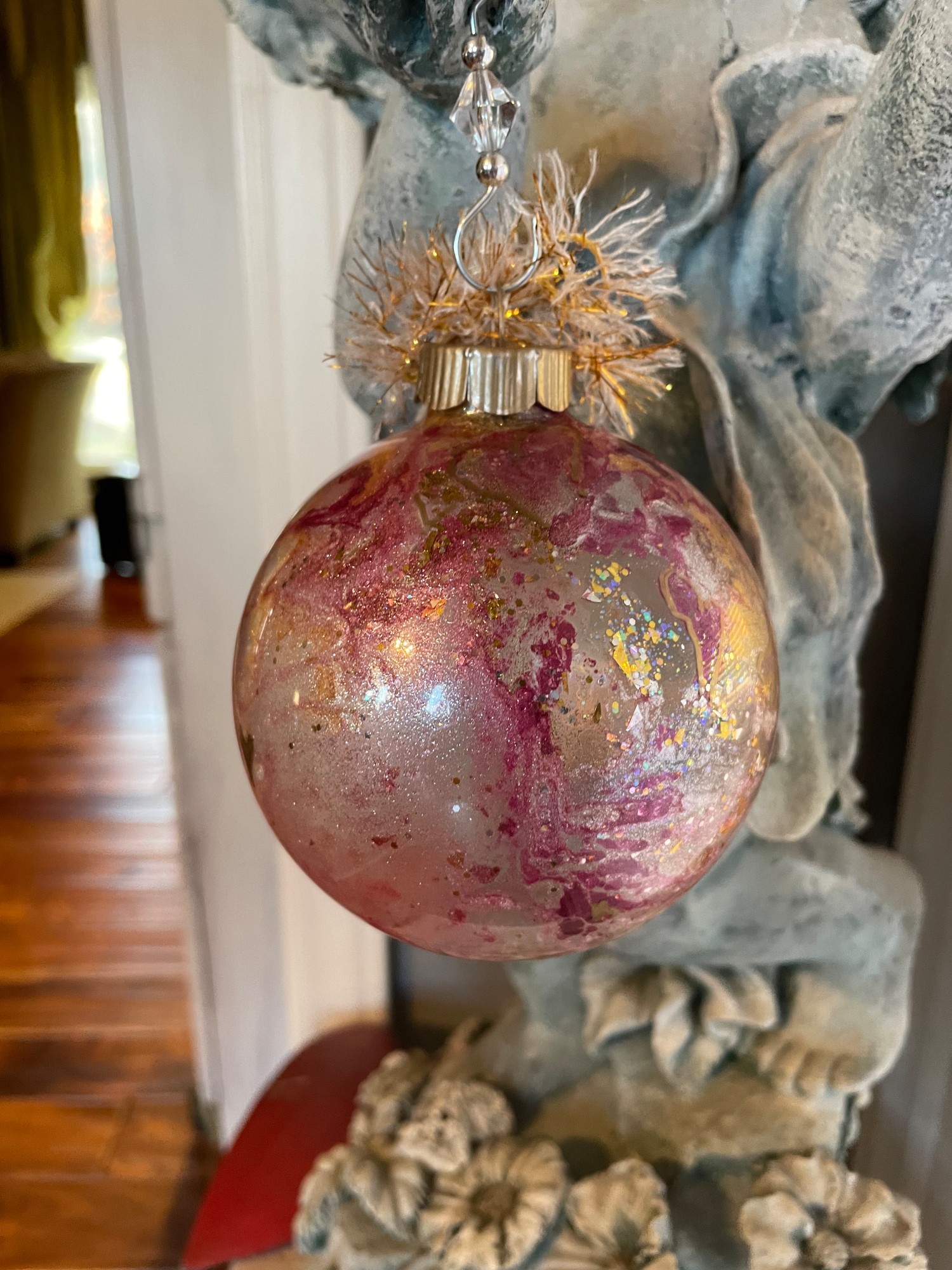 So unique...mostly glitter and shimmer with gold and magenta purple...kind of fancy yet delicate...reminds me of vintage glass..