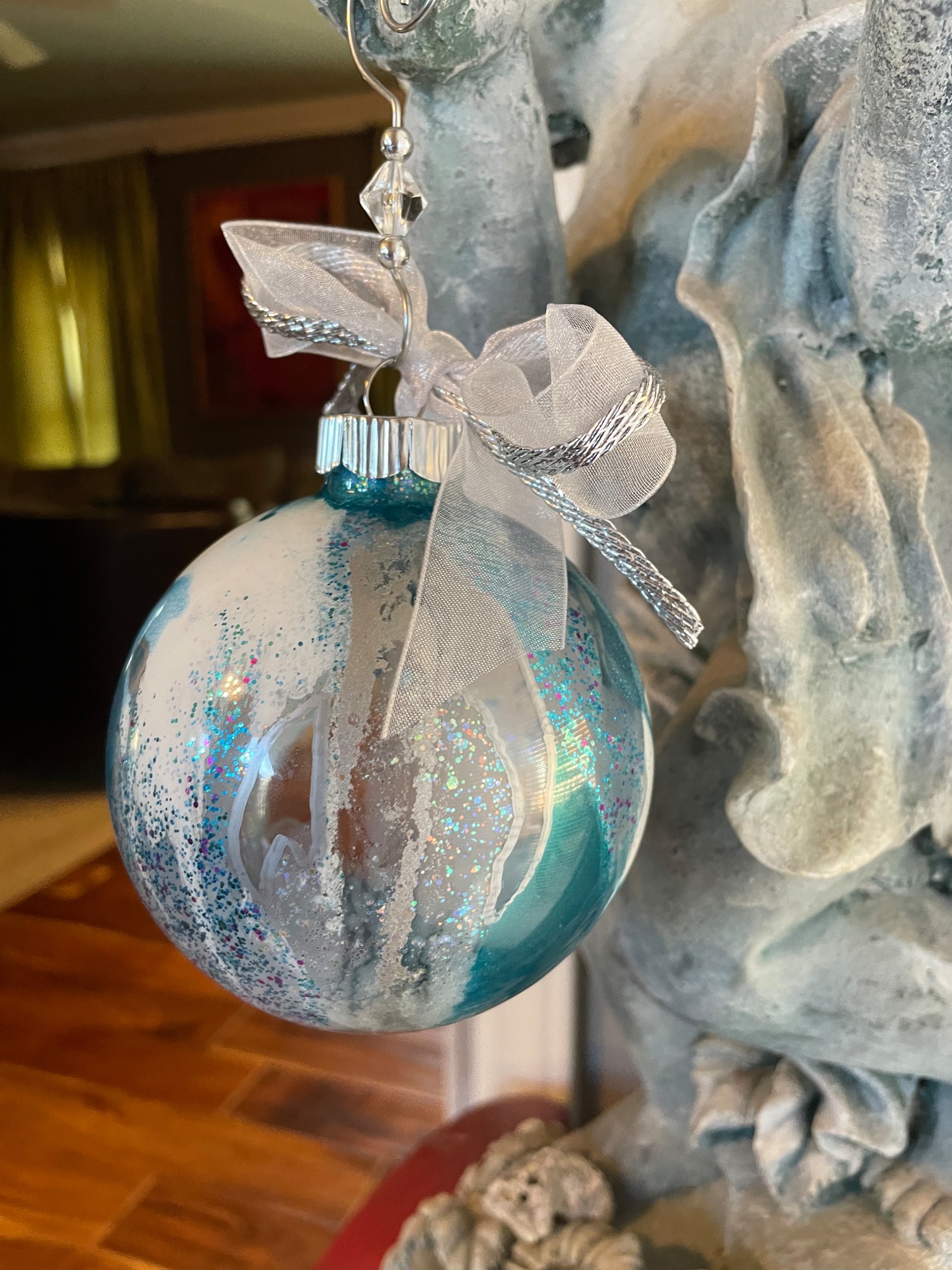 deep rich satin turquoise, white, multi-colored sparkles, with silver accents...beautiful spaces for light to shine through. Makes a great set w #33, #34, #35