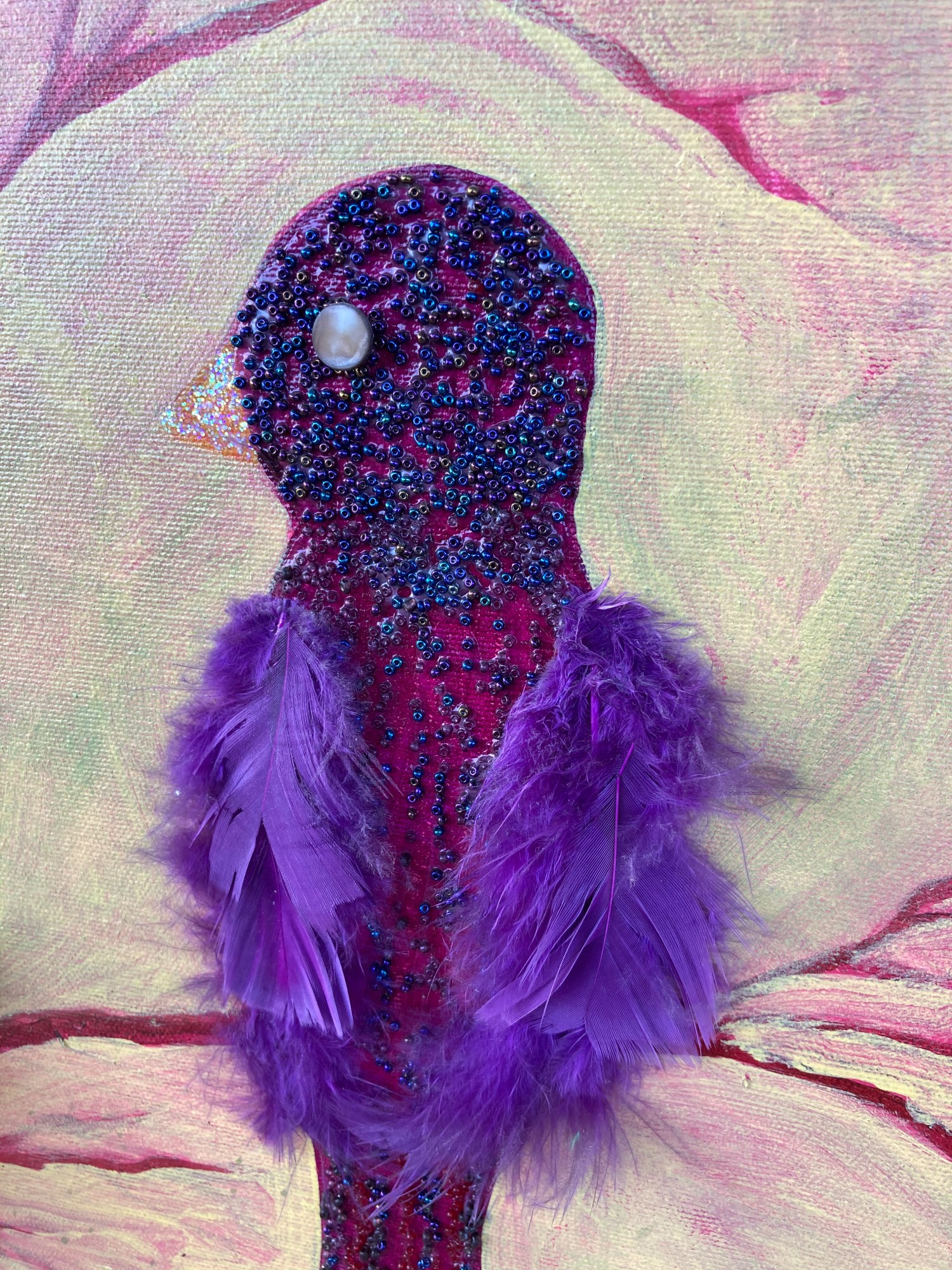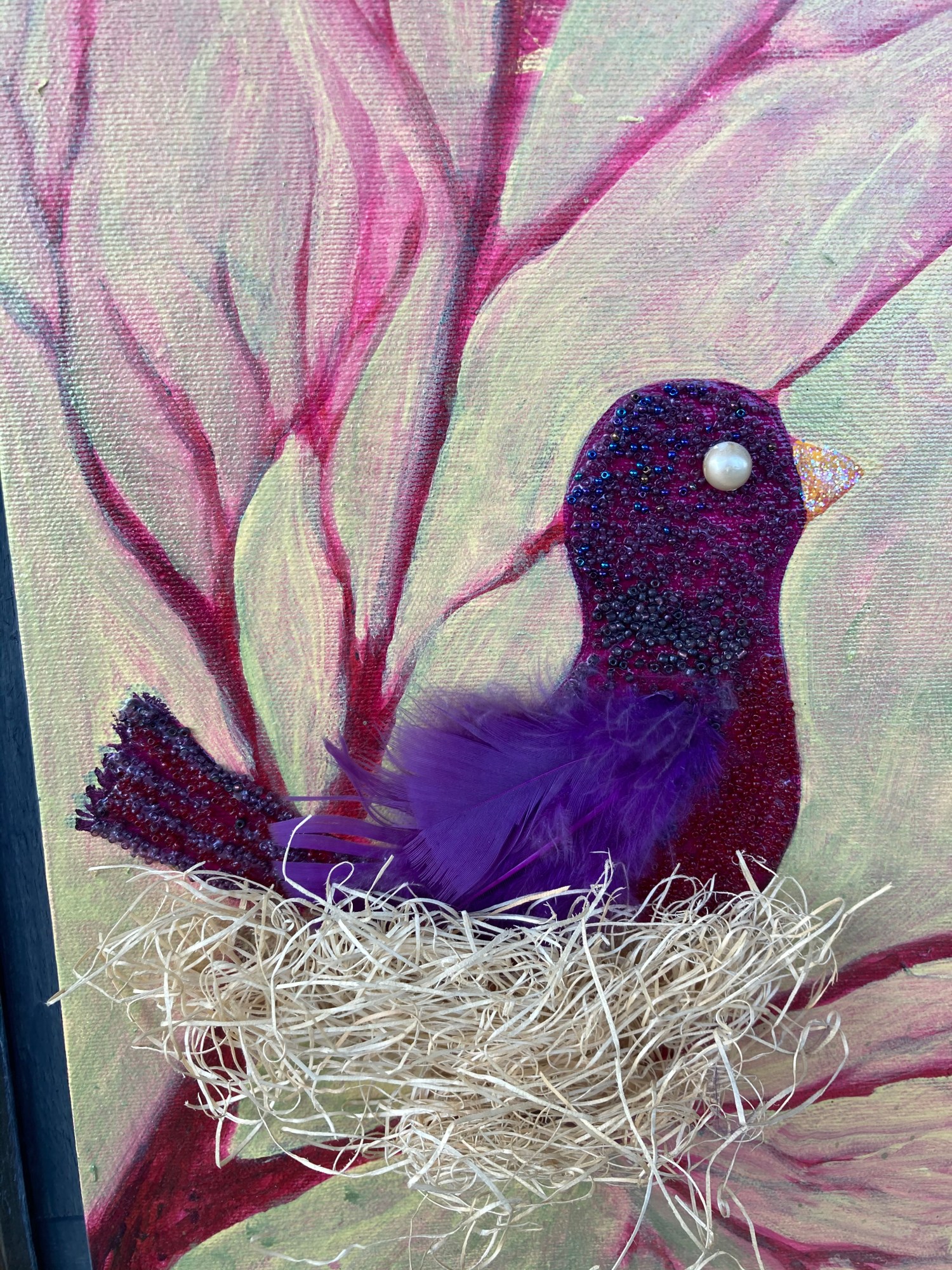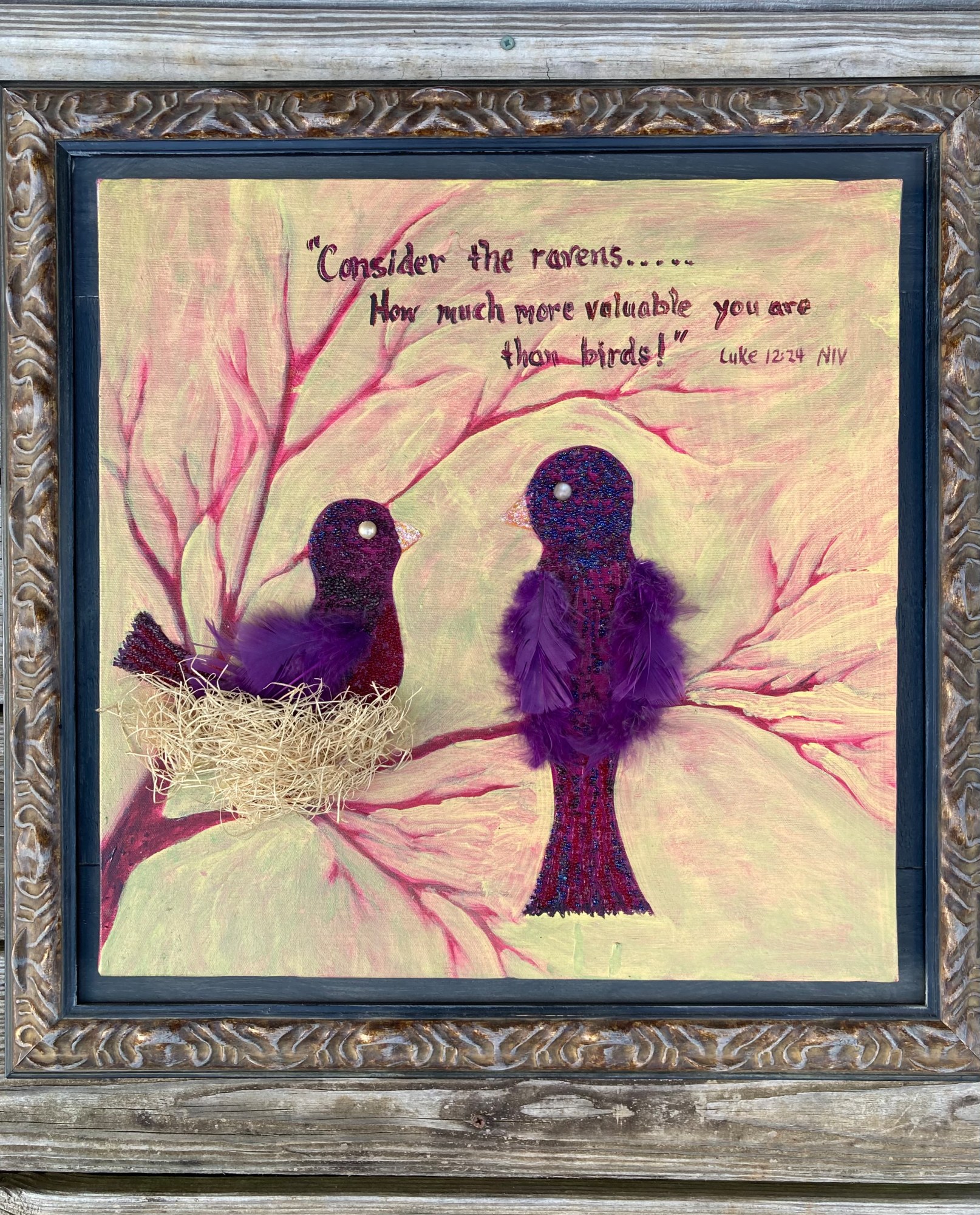Based on the scripture Luke 12:24. These elaborate birds are encrusted in beads and adorned with feathered wings. All complete with a 3-D nest. A fantastical and inspirational piece for any space. It's sure to be a conversation starter.