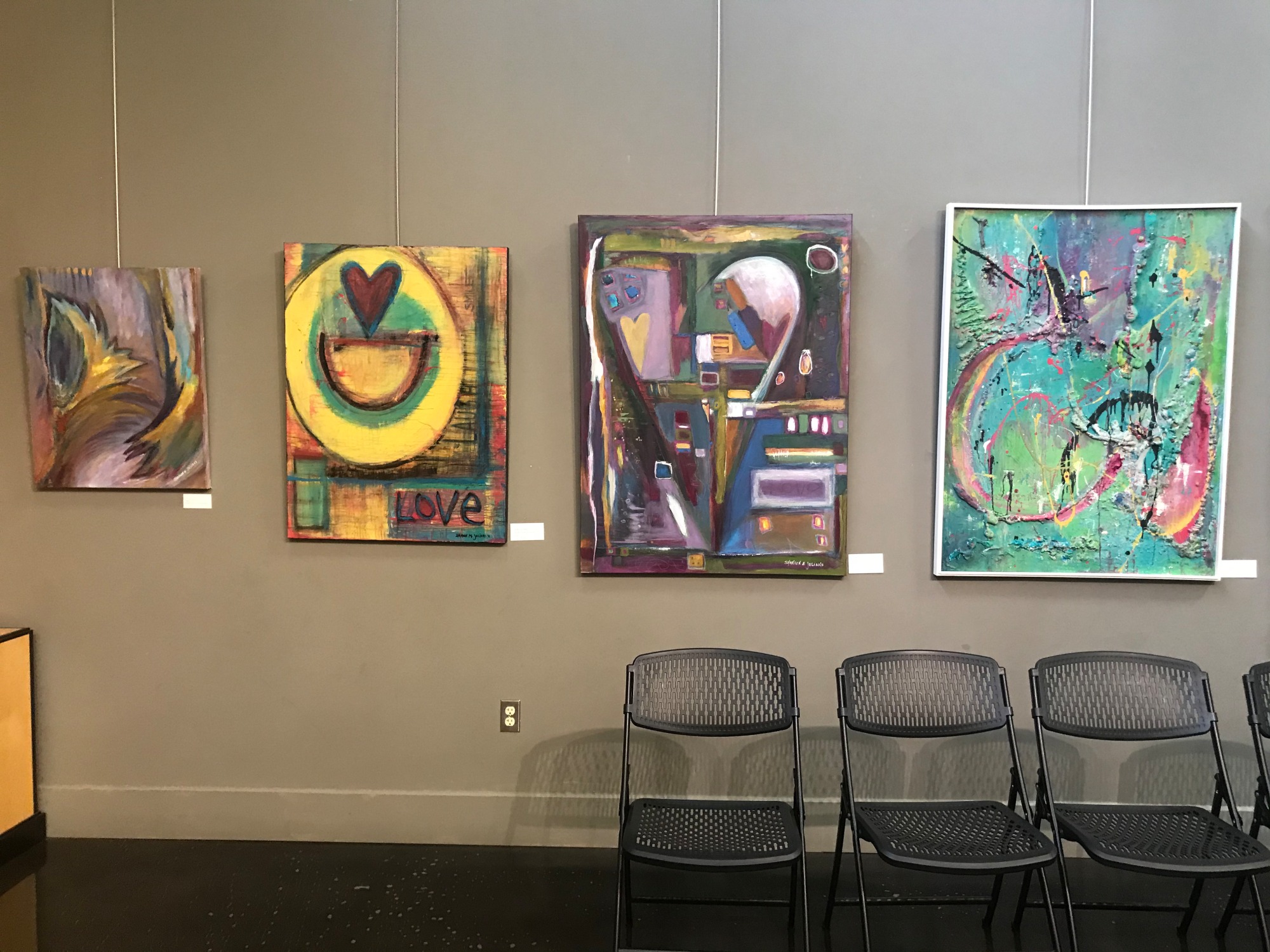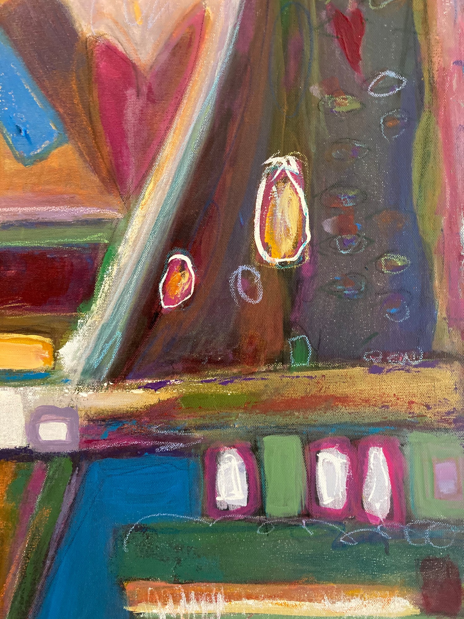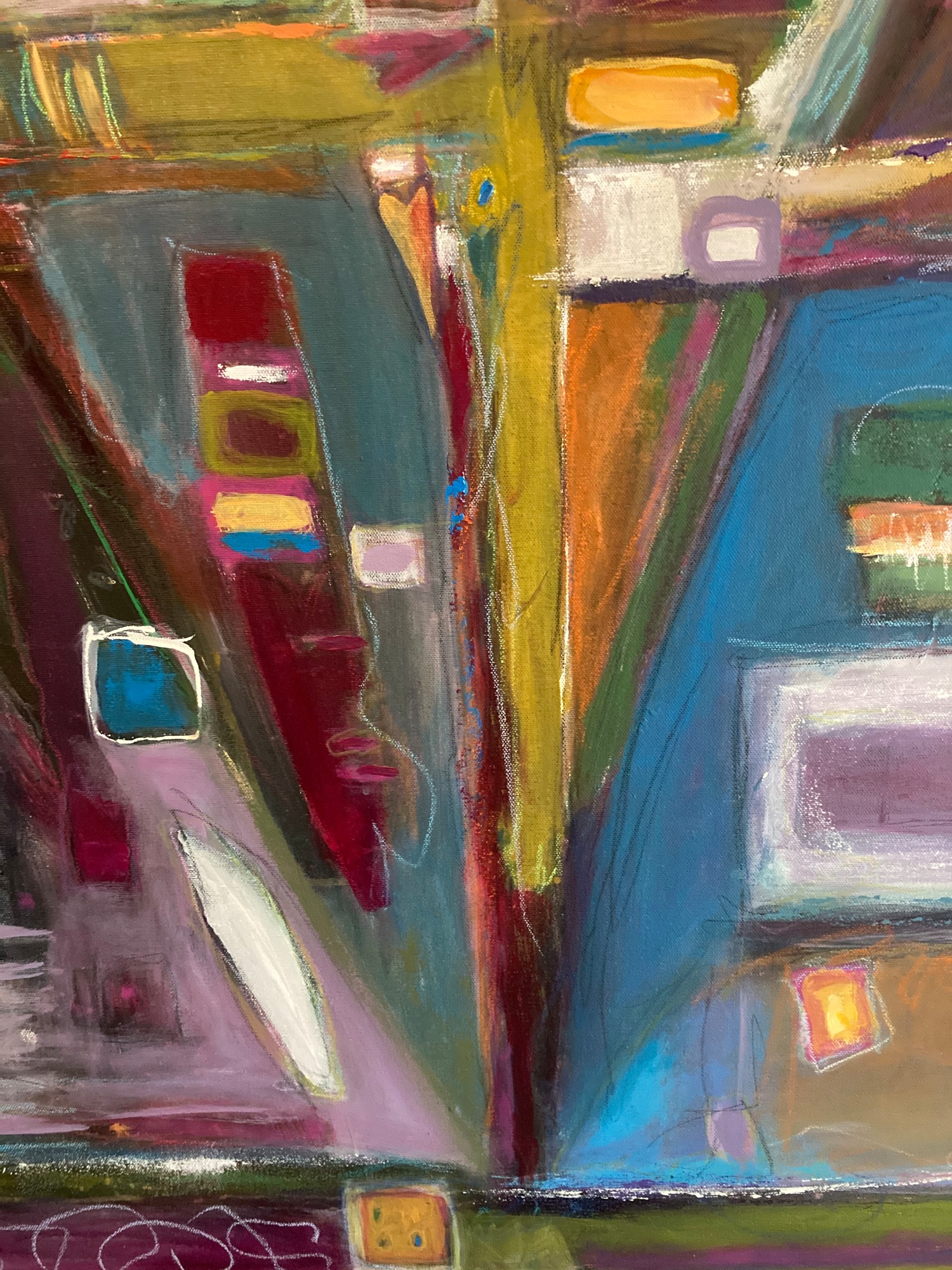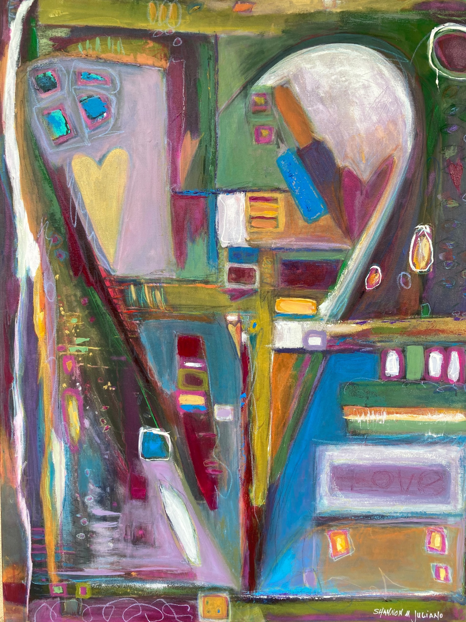 A graphic heart design broken into pieces. Deep purples and greens create a mood of intrigue. This piece will be a dramatic addition to your space...over the mantel, entryway, family room, over a tub, bedroom...limitless opportunities.