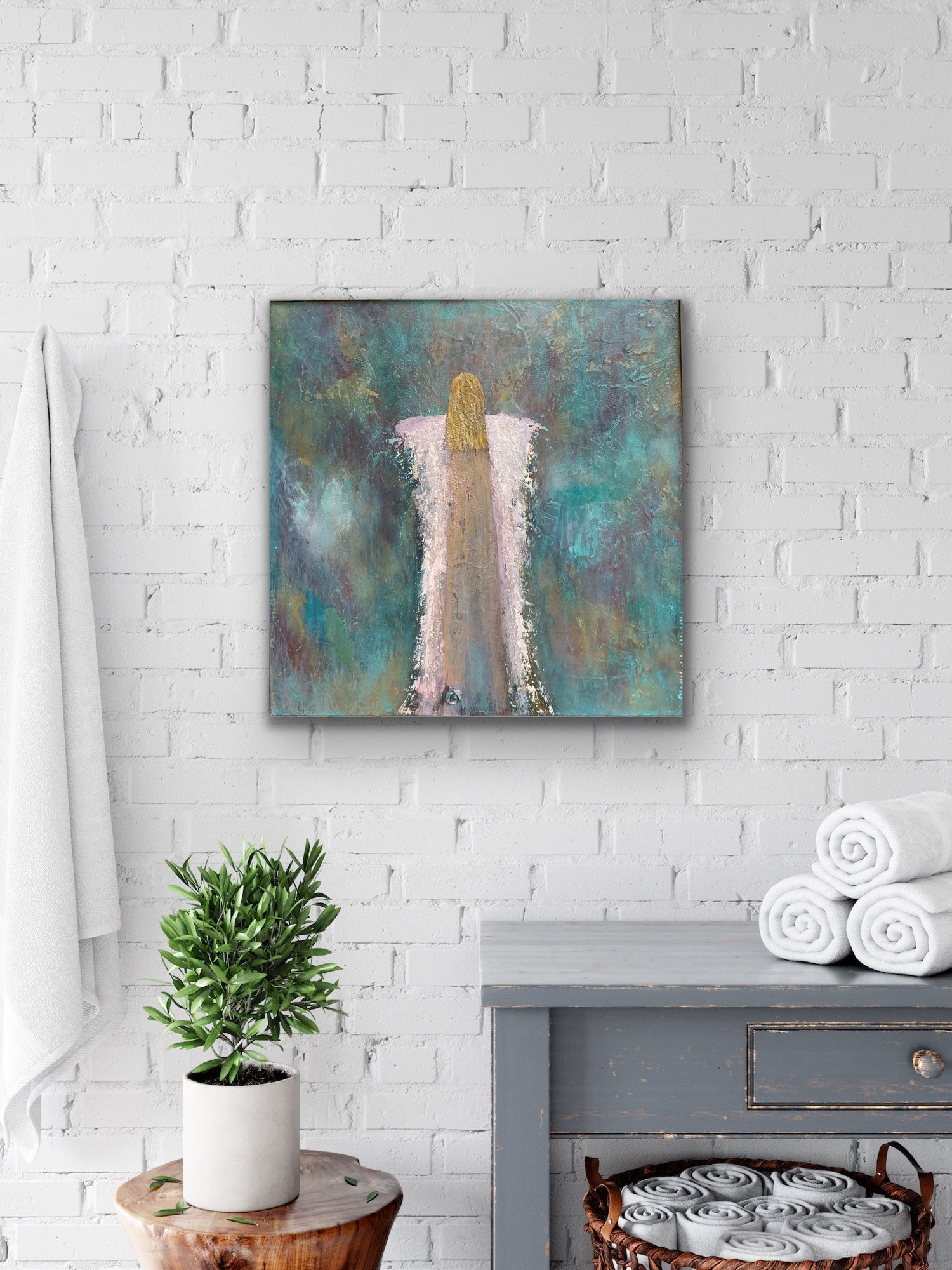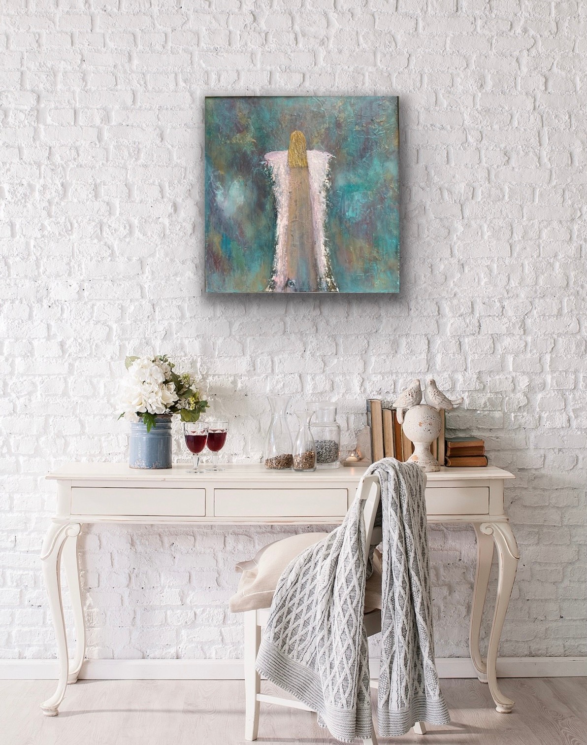 Simply soft and beautiful ethereal feeling. This angel will be a precious addition to your home. The painting is square , although pictured as rectangle.