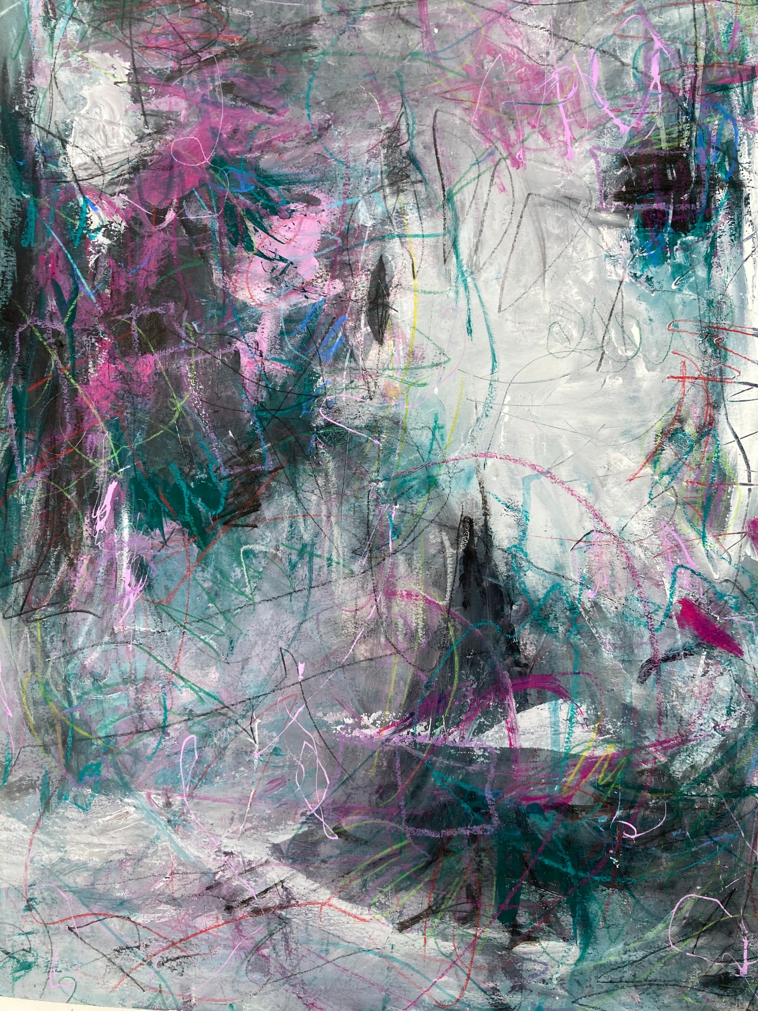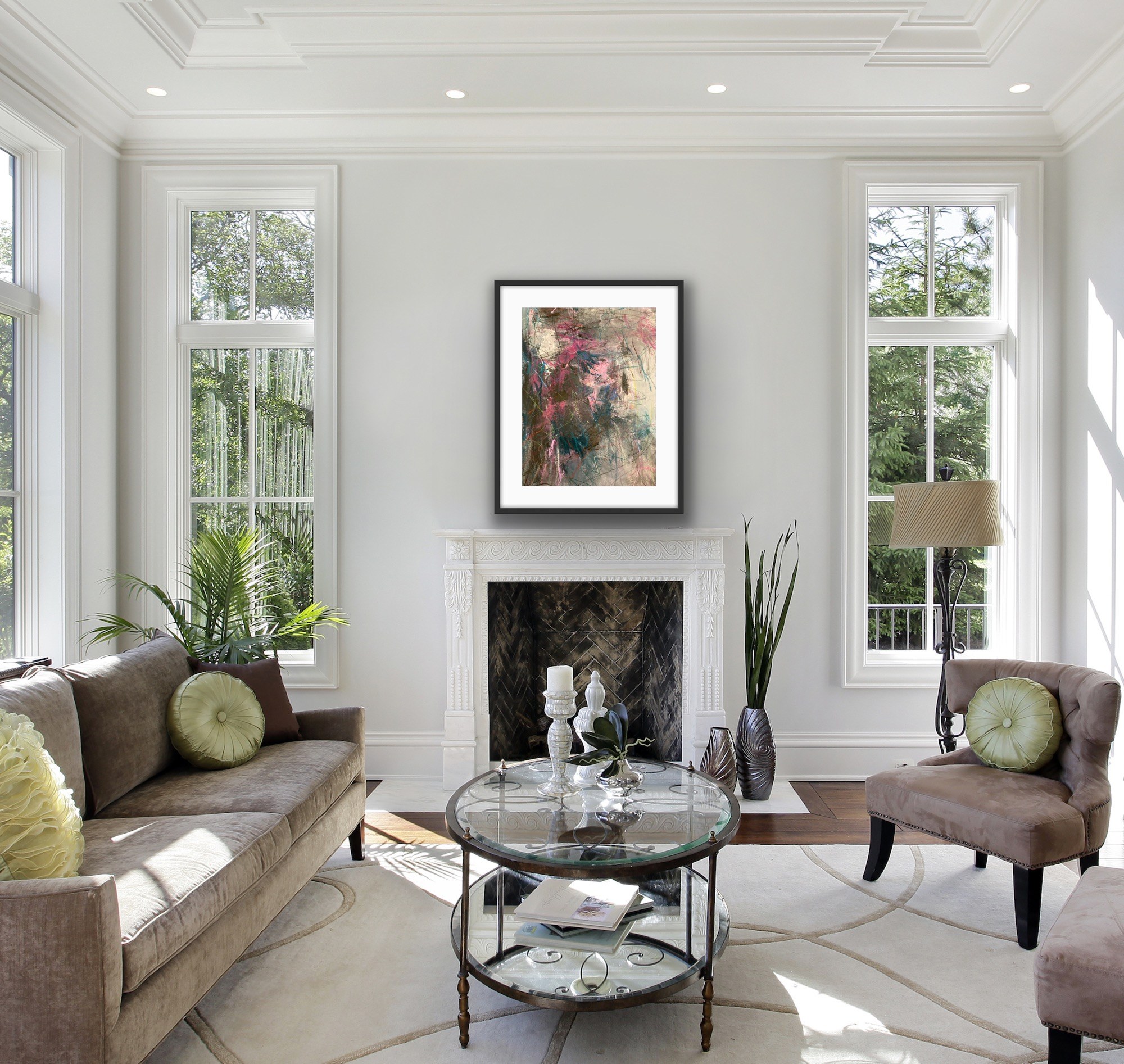 The layered color palette creates a feeling of looking out from the inside. Playful markings give this piece an organic feeling.