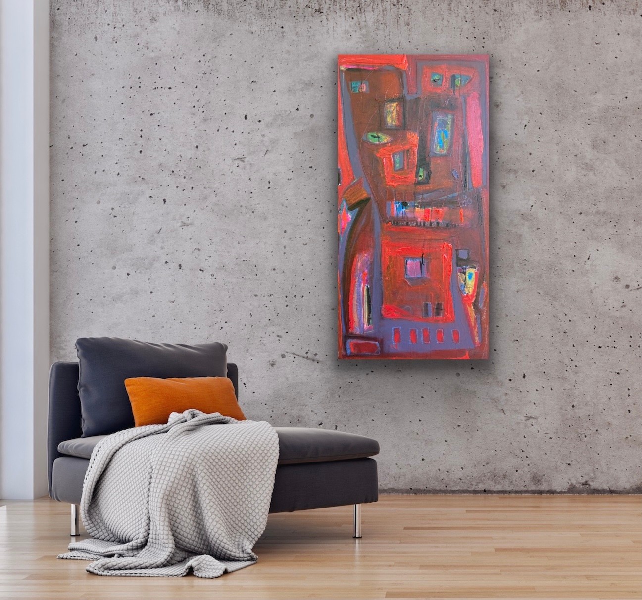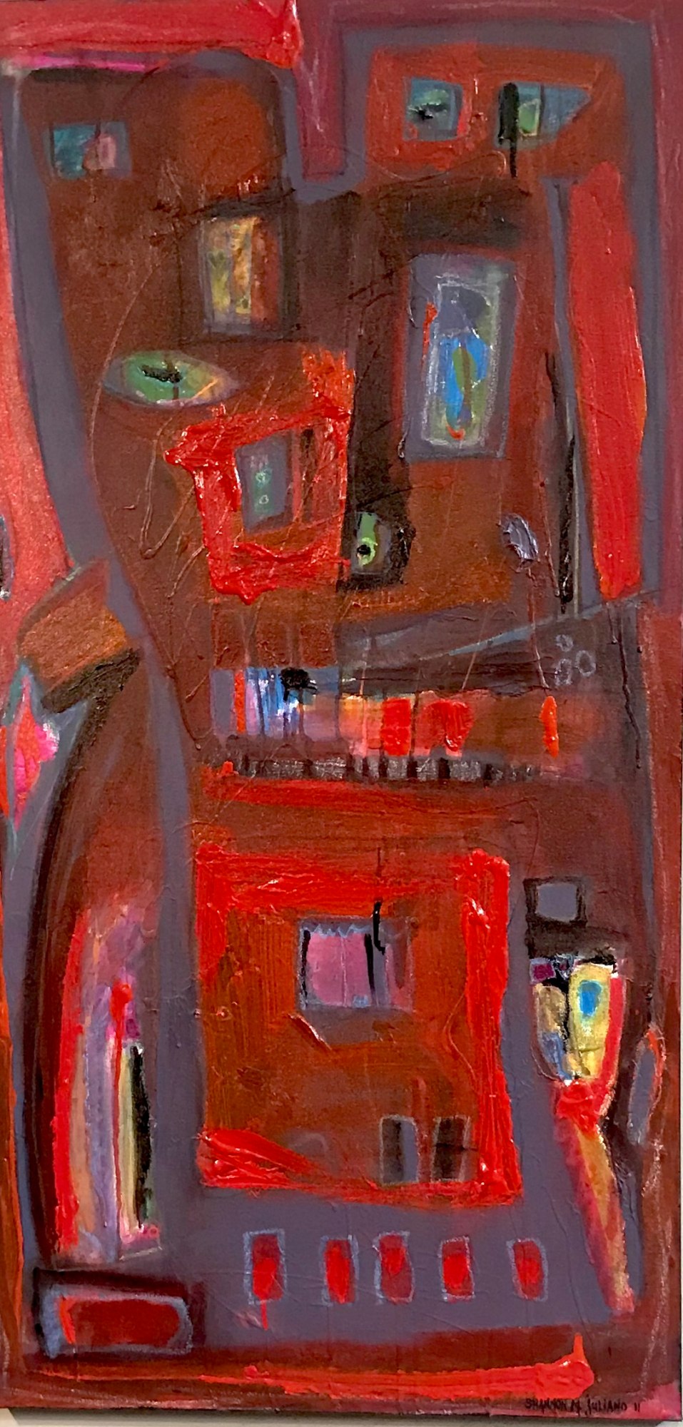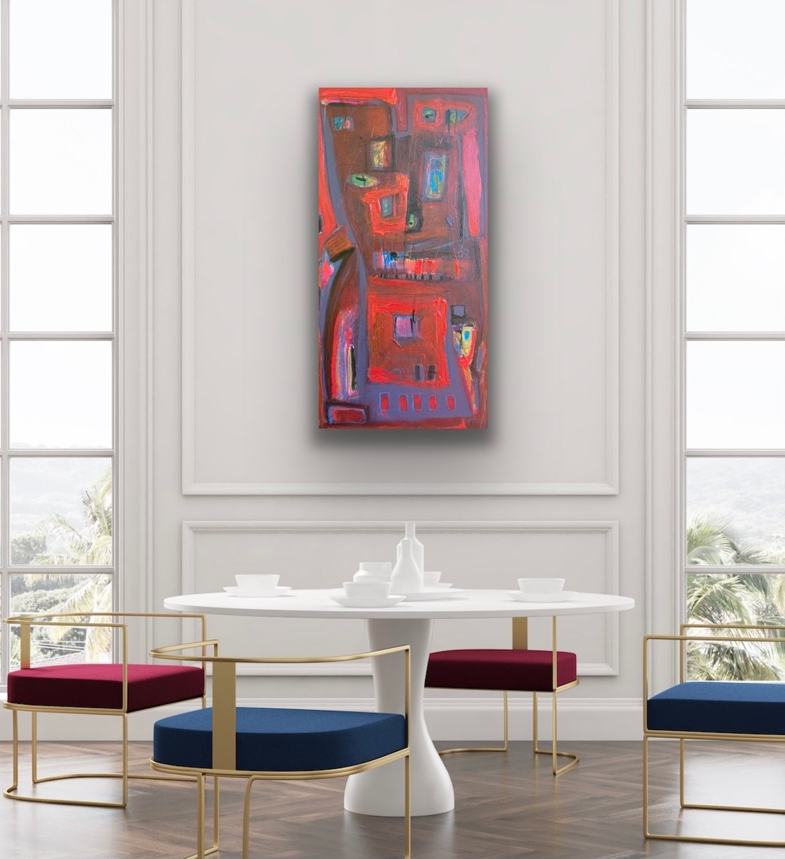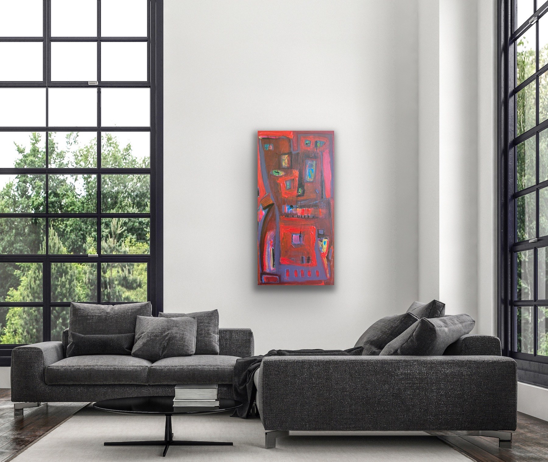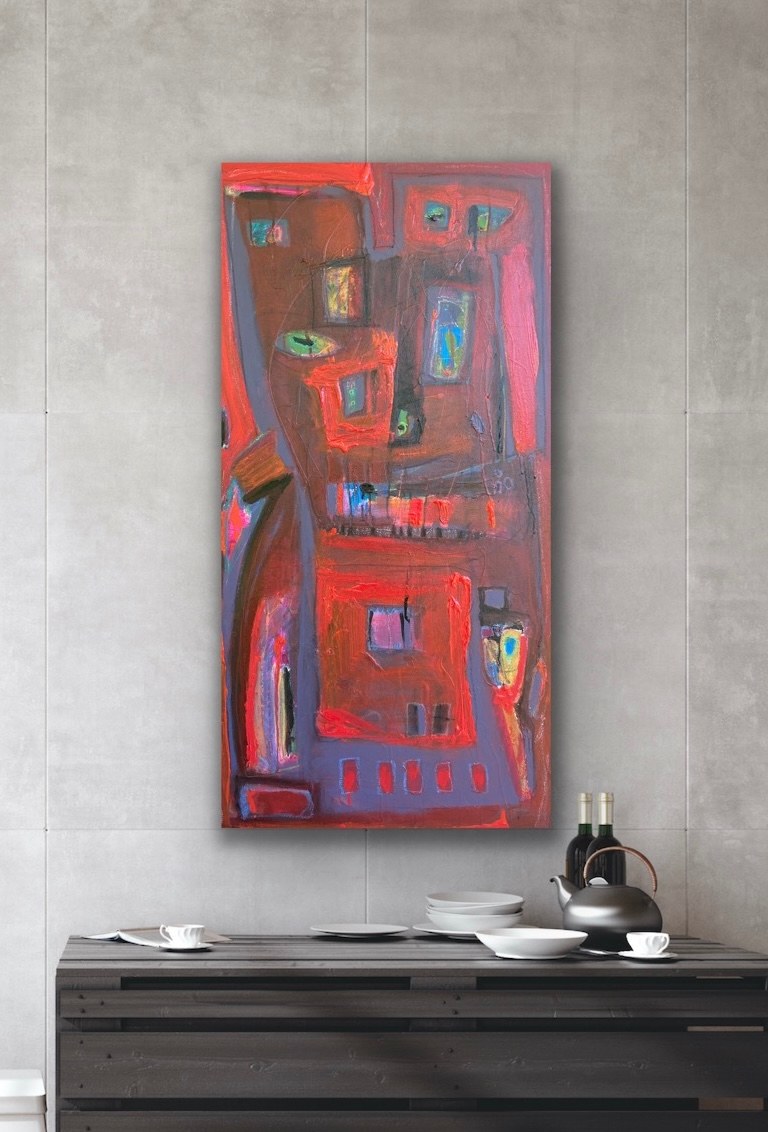 If you love red, this is your piece. This bold splash of color reads as a cool abstract cityscape. Perfect for contemporary, transitional, or traditional spaces to add your own flair.
