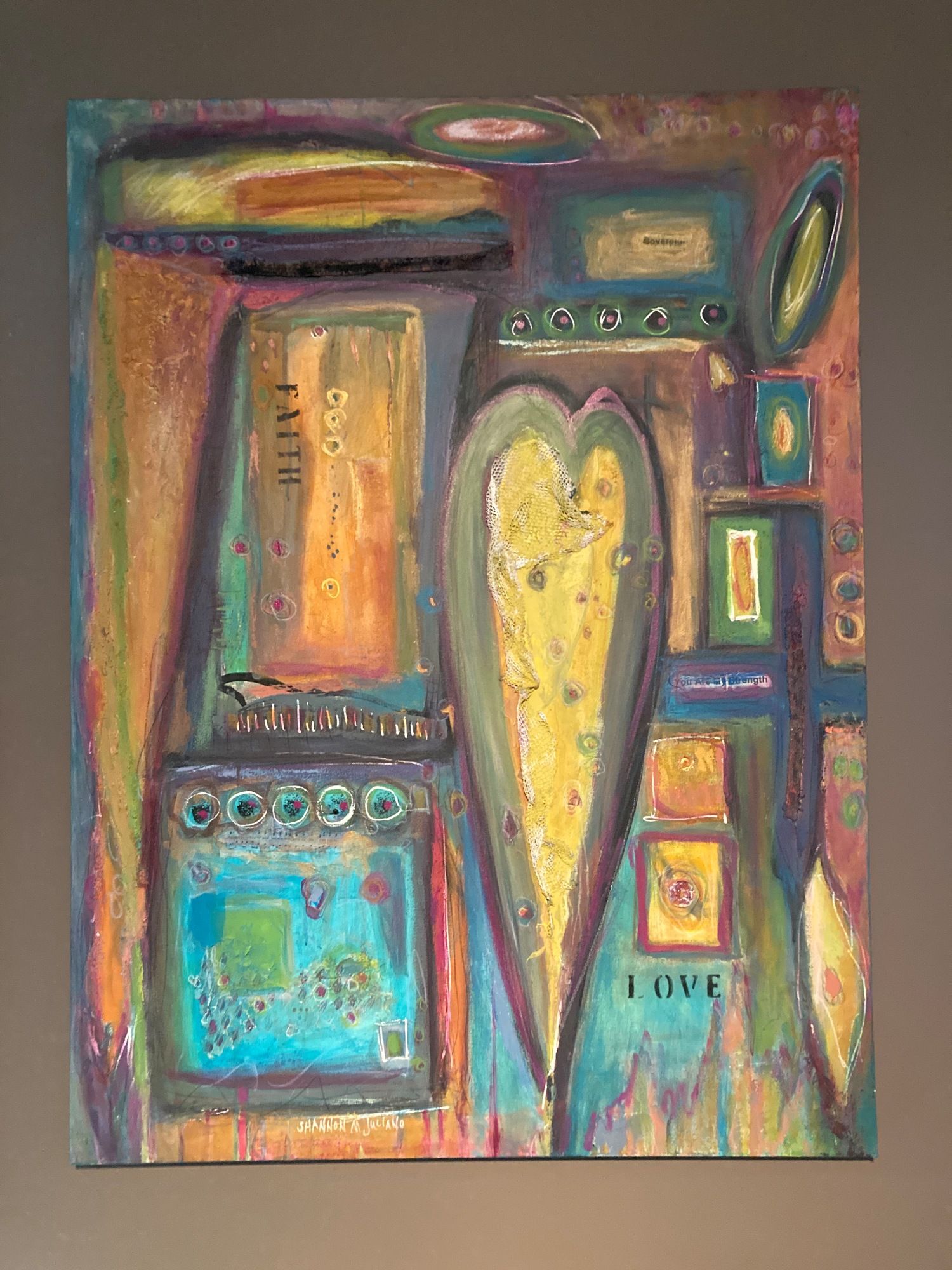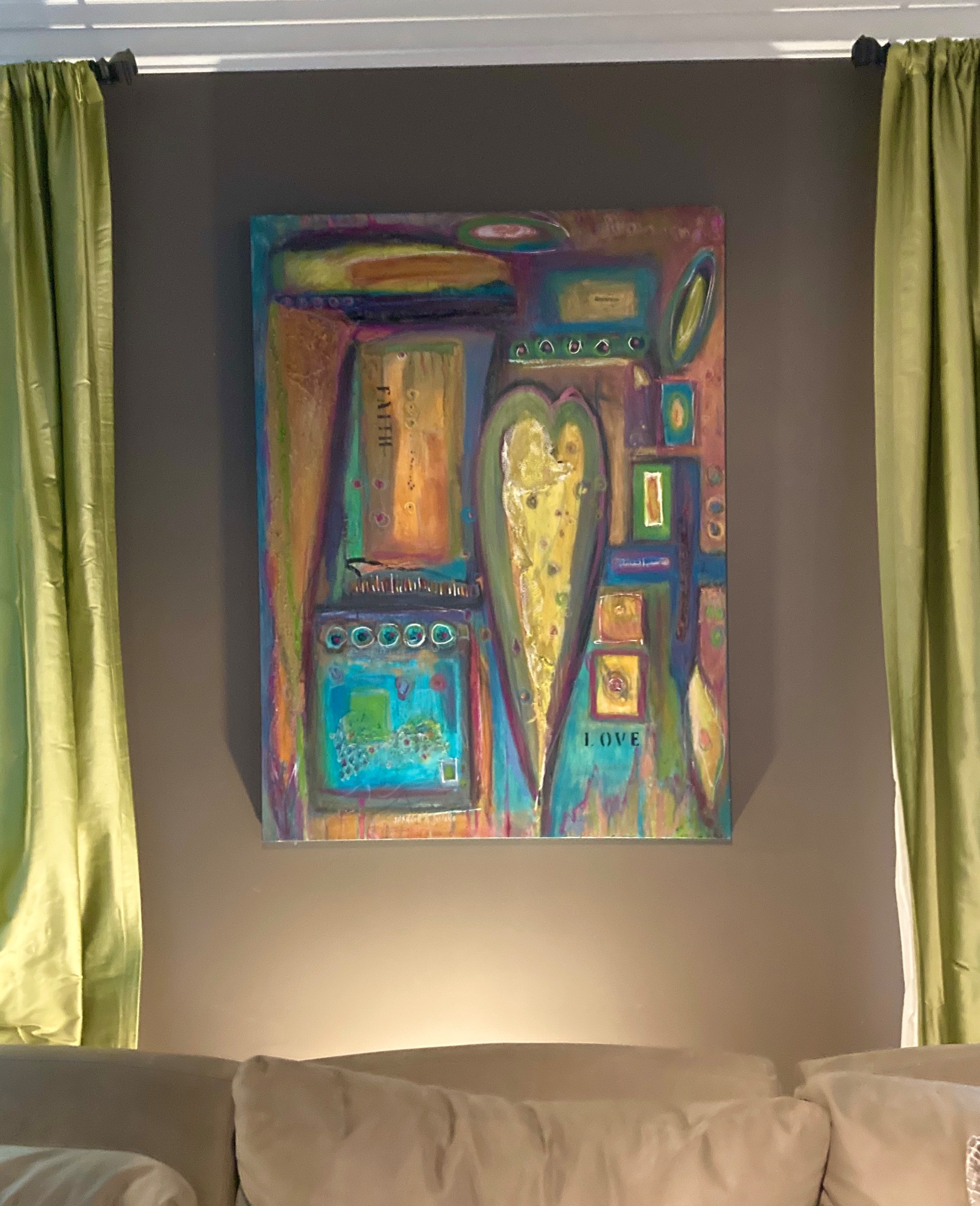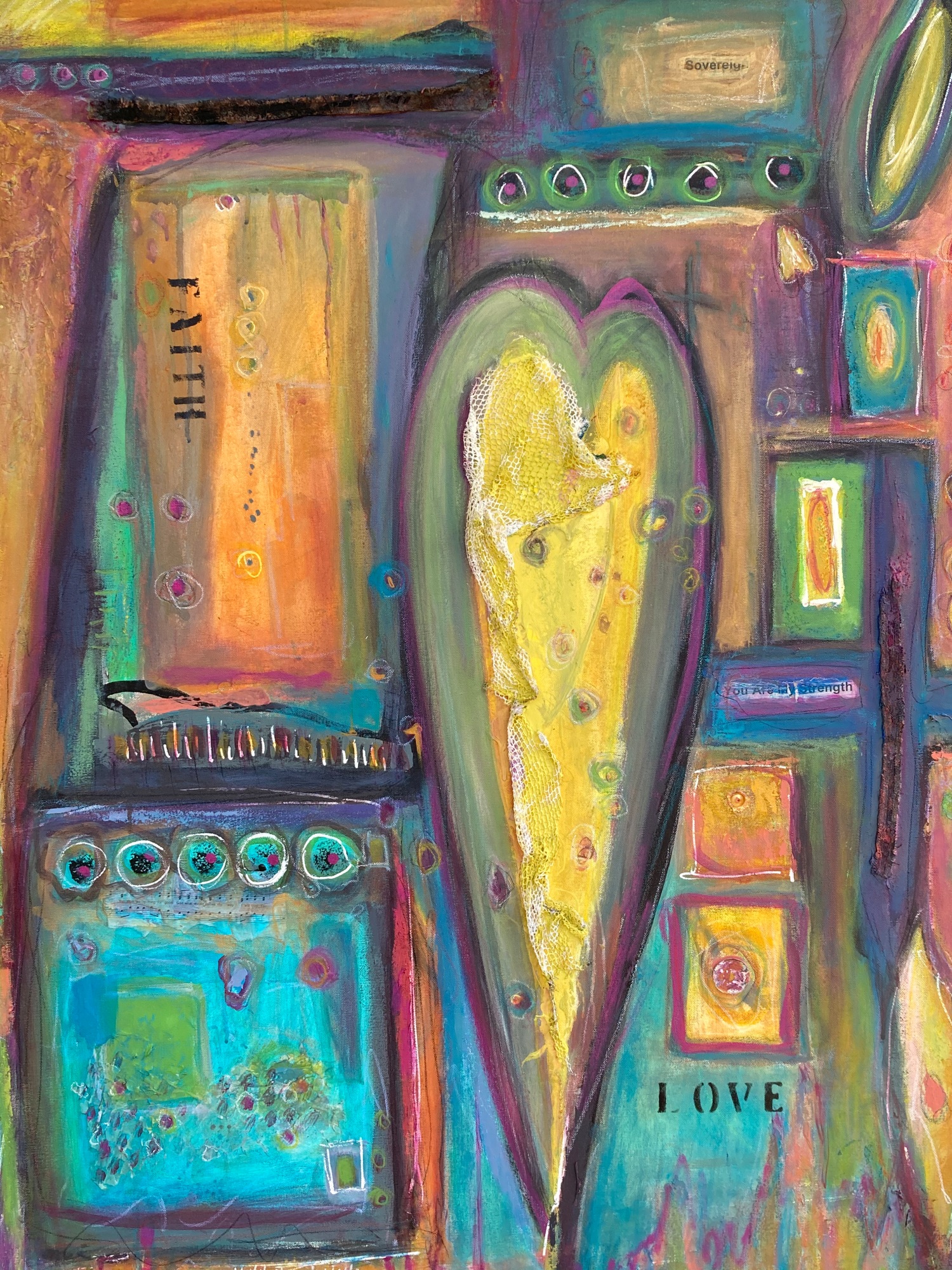 Fun heart motif with touches of scripture in bold bright colors. This piece includes some cool mixed media elements for added interest.