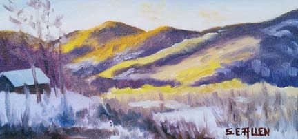 This painting was created in late afternoon while standing at the back of the lower level of the Scenic Overlook in Intervale, NH. As the sun got lower in the sky, the snow on the mountains took on a golden glow.