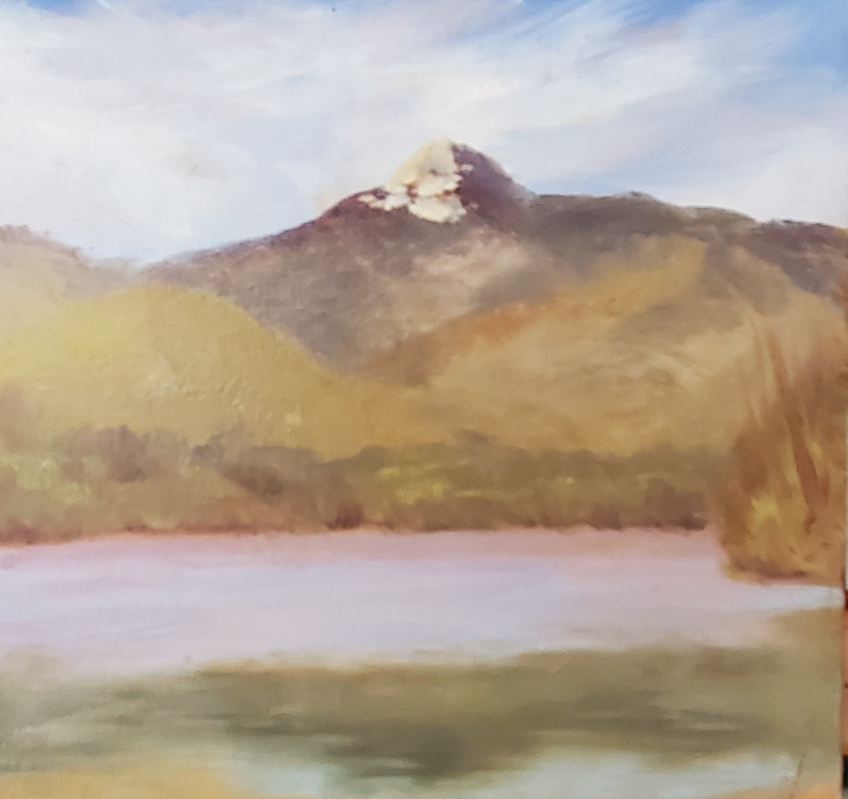 This is a depiction of Mt. Chocorua from the viewing area on Chocorua Lake Road. It is painted on a cradled wooden panel and needs no frame.