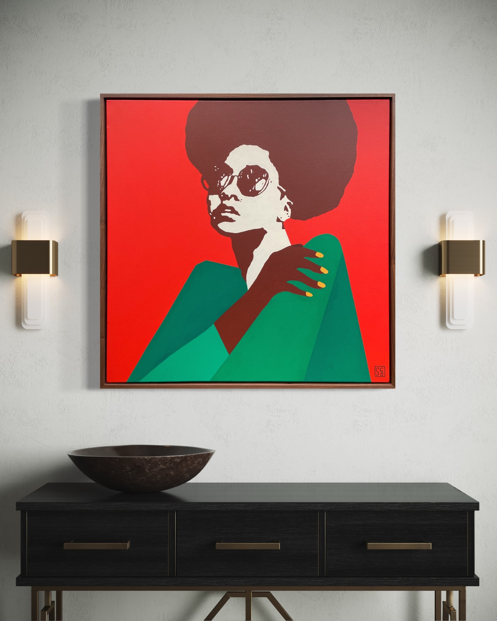 What boundless possibilities does she envisage for her future? Acrylic on gallery wrapped canvas, embedded in beautiful locally crafted walnut floating frame. Matte varnish provides protective finish. Wired and ready to hang.