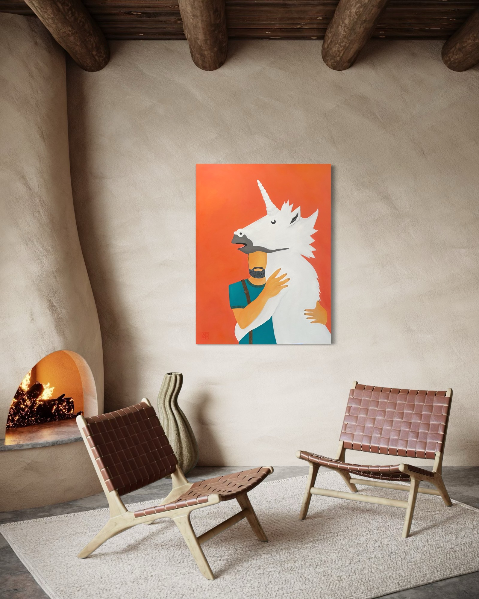 Acrylic on gallery wrapped canvas. Inspired by a photo I took years ago on the back patio of a North Portland restaurant and bar. It’s always a good day when you look up and see a hugging unicorn in your midst!