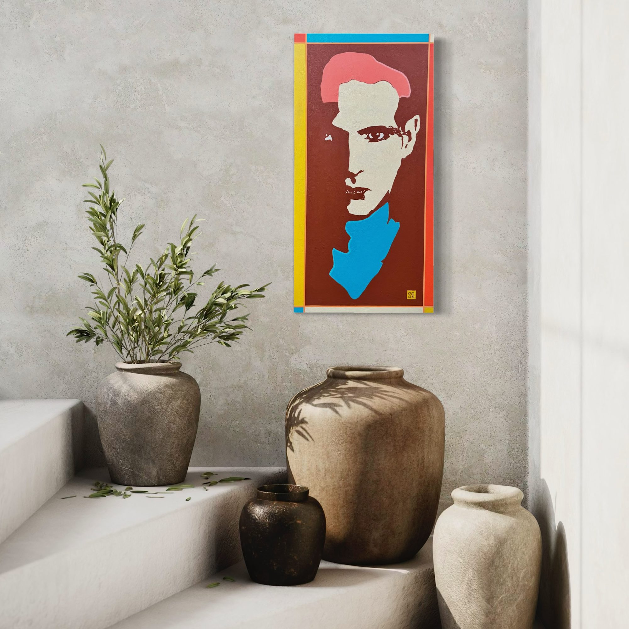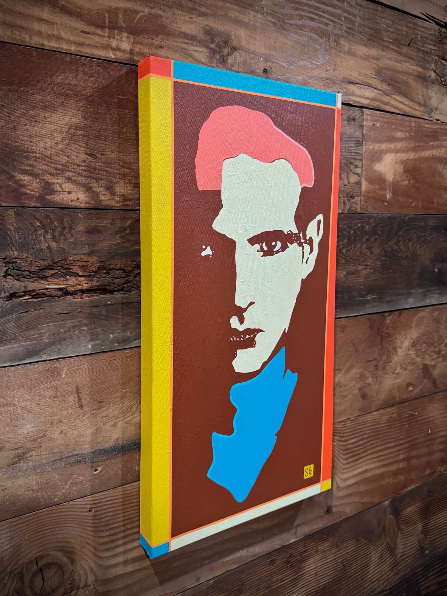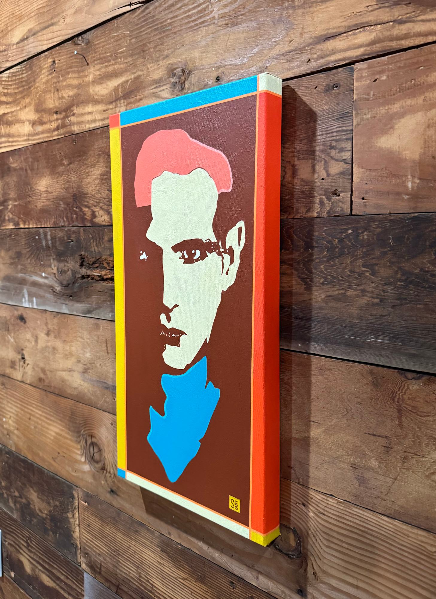 I love creating vibrant, pop-inspired portrait paintings that bring bold colors and dynamic compositions to life and am always game for a 1960s inspired color palette. Acrylic on gallery wrapped canvas with light texture paste and protected with matte varnish. Wired and ready to hang.