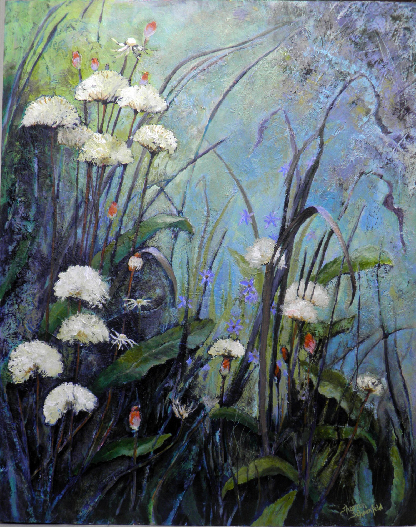I came across these end of season flowers on a cool September morning at Wanuskewin Heritage Park near Saskatoon, Sk. They were actually very tiny and close to the ground; the dandelion leaves and prairie grasses were all tangled up around flower stalks. The sharp contrast of the deep shadows at the base of the foliage and the bright seed puffs are what caught my eye for this painting.