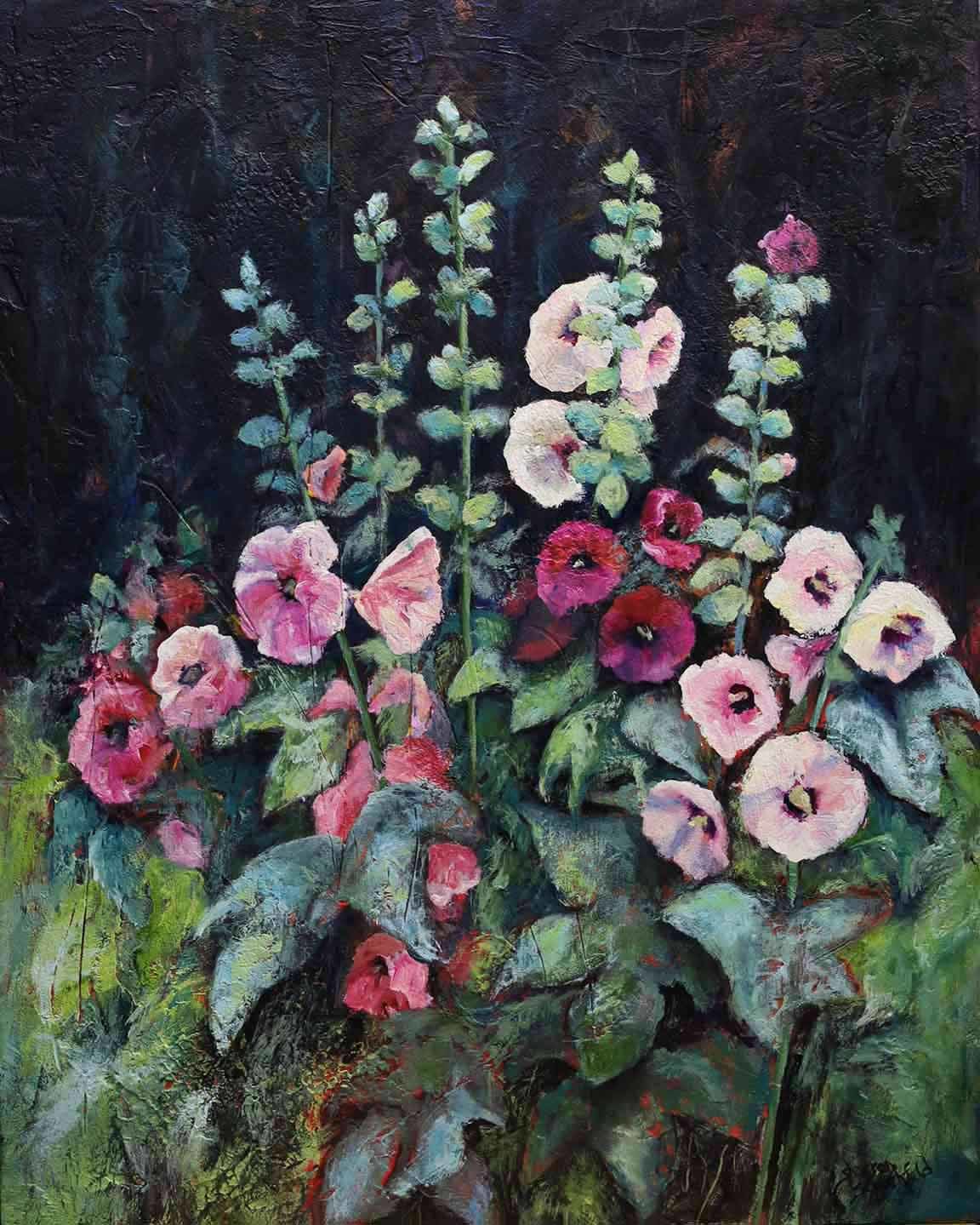 Hollyhocks basking in the hot sun always take me back to my grandmother’s backyard when I was a child. The sun shone hot on her south facing garage where her rhubarb and hollyhocks soaked up the summer sun.