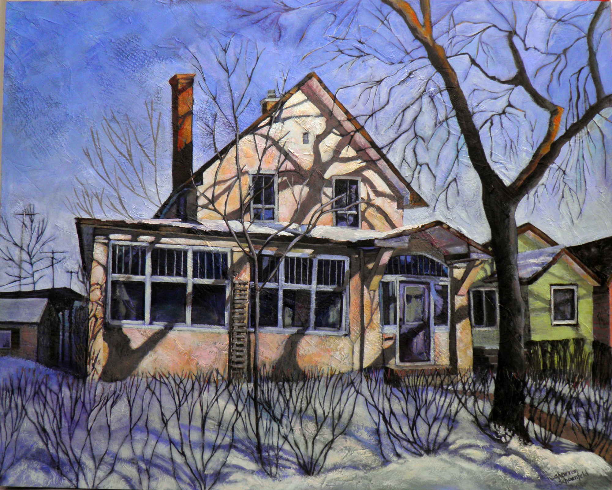 In 1921 this property became the family home of William and Fanny Landa. William Landa was a carriage maker who immigrated from Russia and established the Landa Carriage Works that eventually became the Landa Auto Body Works. Now designated as a municipal heritage property, the home located at 202 Avenue E South has cultural and historical significance in the community because the Landas were among the first Jewish immigrants to settle in the city as well as the Prairie Vernacular architectural style of this home. Reference photo used for this painting taken by Greg Pender of the Saskatoon Star Phoenix, used with permission.