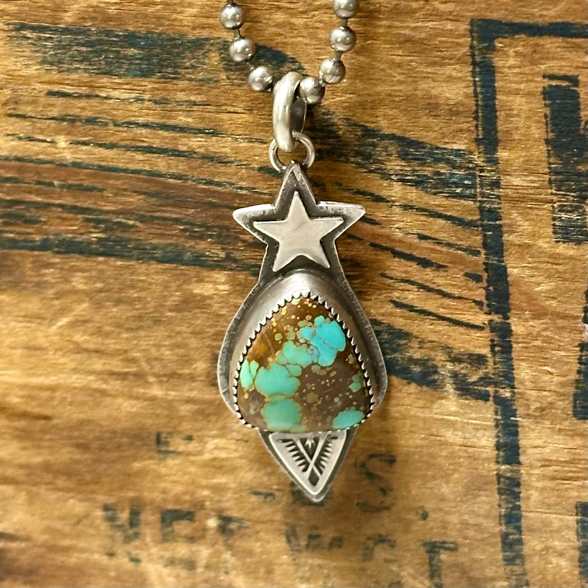 Worn like a relic of the land itself, the Desert Star pendant captures the untamed beauty of the Southwest in its purest form. At its center lies an organically-shaped Black Hills turquoise stone from Nevada —smooth, natural, and alive with vivid teal, russet, and sienna hues. No two turquoise stones are alike, each echoing the desert floor and sky in its rich, earthy color palette.
