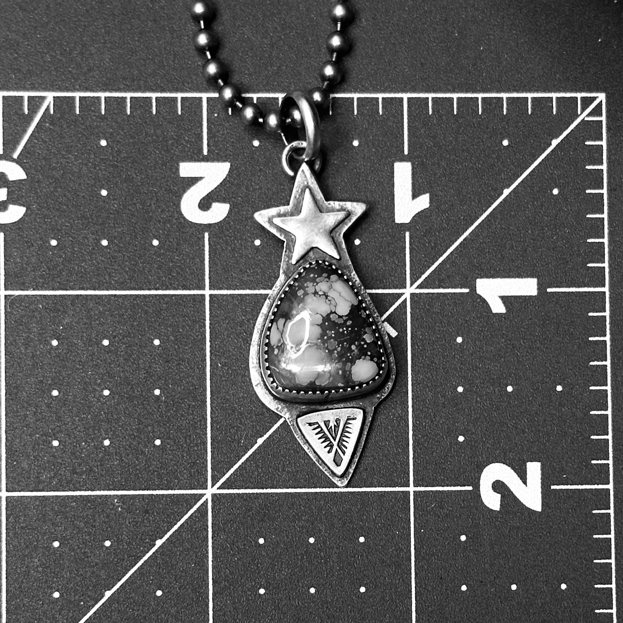 Set in a hand-hammered sterling silver backing with an anvil-forged texture, the pendant radiates depth and dimension. A five-pointed star in polished silver crowns the pendant, offering a quiet symbol of guidance, direction, and connection to the cosmos. Deep oxidization accentuate the interplay between shadow and shine, grounding the celestial element in raw materiality.