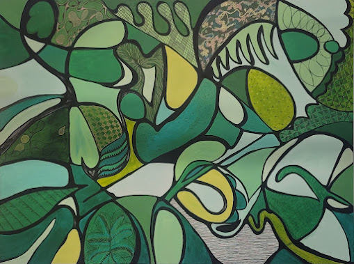 This title metaphorically connects the paths in the painting with the veins that run through a living being, symbolizing the vital journey of life. The painting's green tones evoke a sense of growth and renewal, while the intricate lines represent our paths, each pause and intersection highlighting the critical moments and decisions that shape our lives. The black ink and metallic details further emphasize the significance of these journeys, capturing the depth and complexity of our experiences in the broader tapestry of existence.