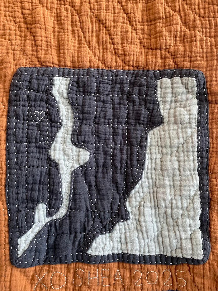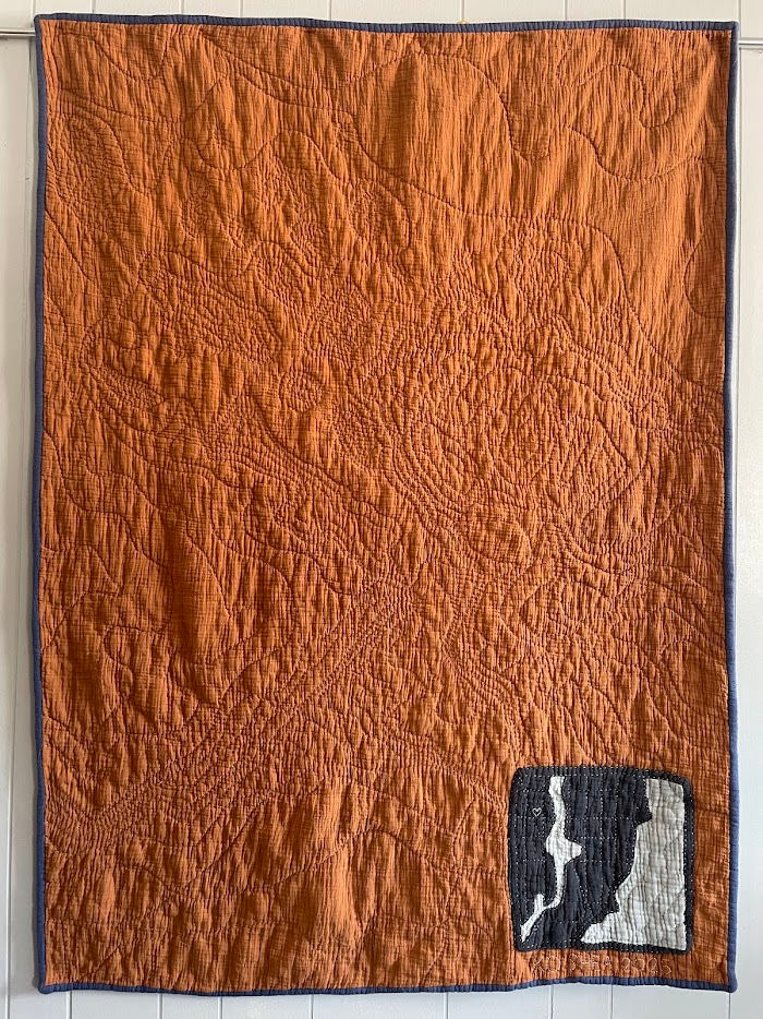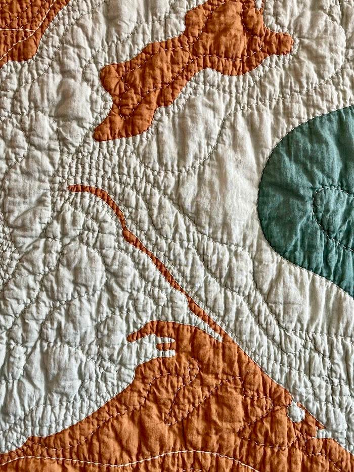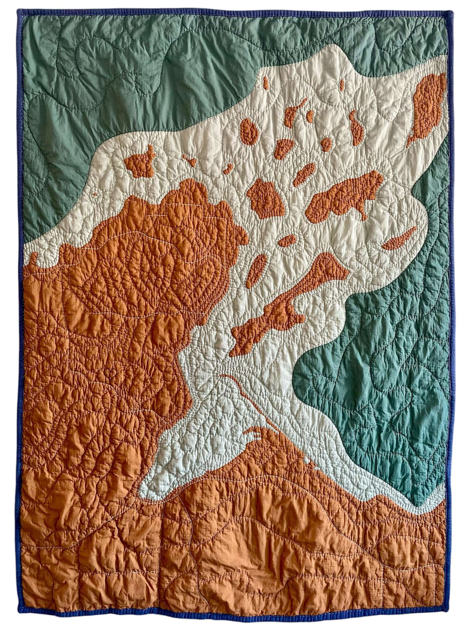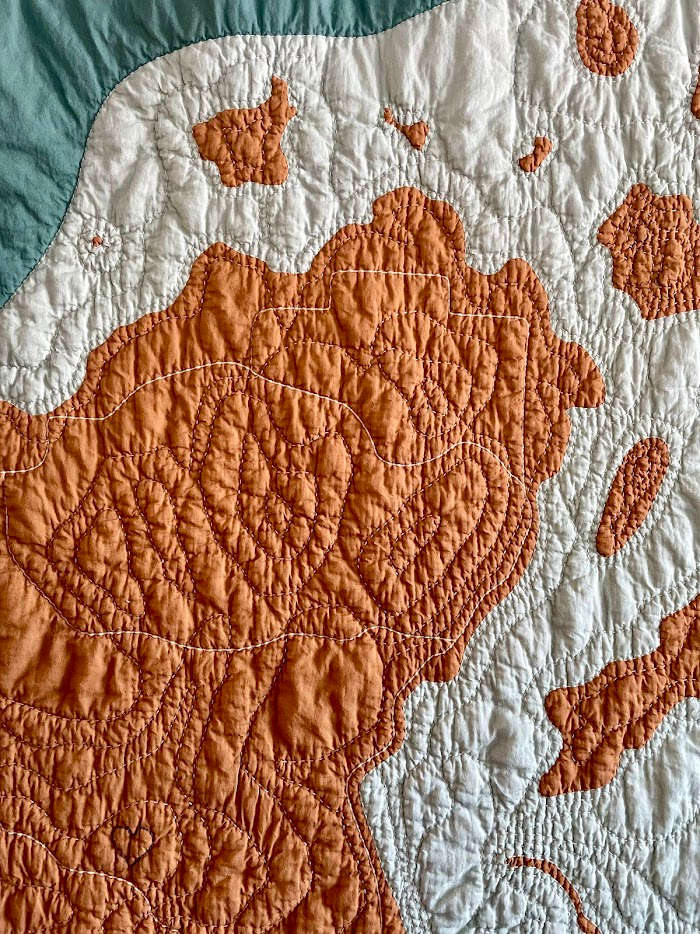 The Apostle Islands is an archipelago along the southern shore of Lake Superior. From relaxing days spent on the beach to adventures on the lake, I hope to evoke a sense of place and connection to these lands and waters that so many of us hold dear to our hearts. For this quilt, I used Adobe Illustrator to design the image which I had professionally printed on fabric, and then quilted it entirely by hand. (75)