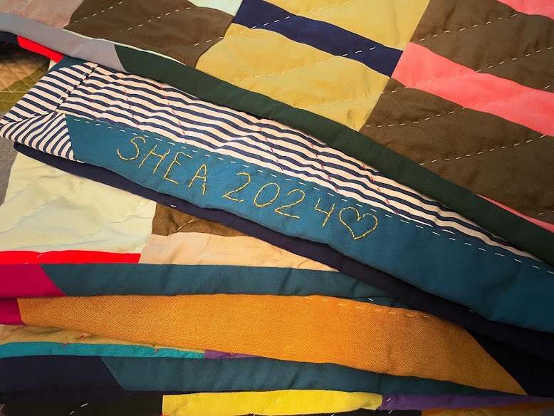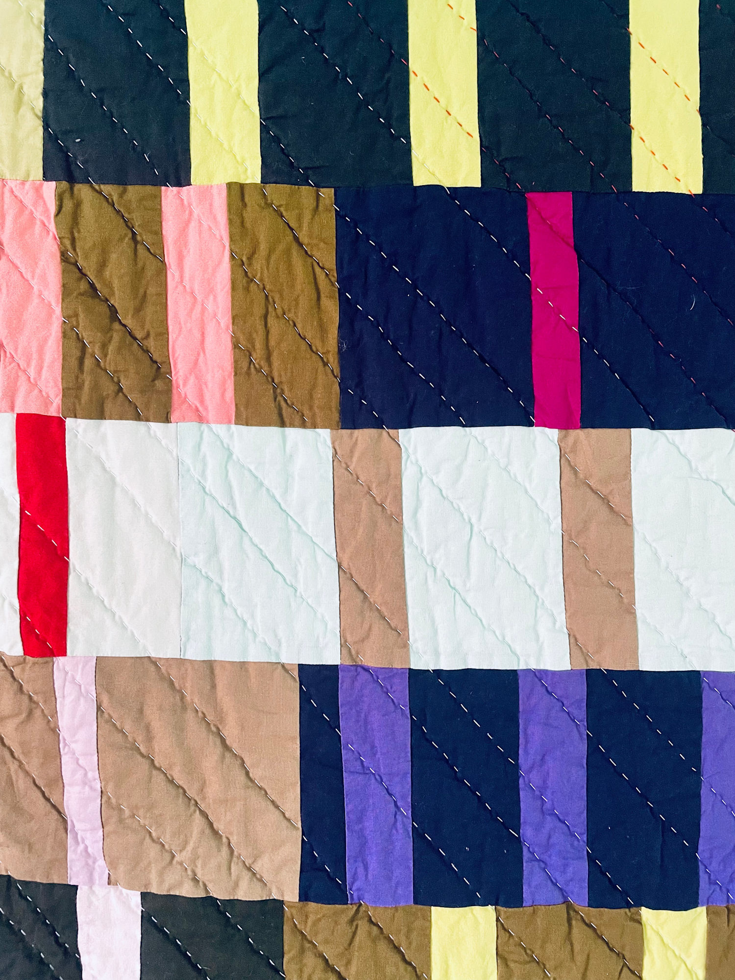 The quilt is made from vaious repurposed and new cotton fabrics, machine pieced, and quilted by hand using 12 weight cotton thread.