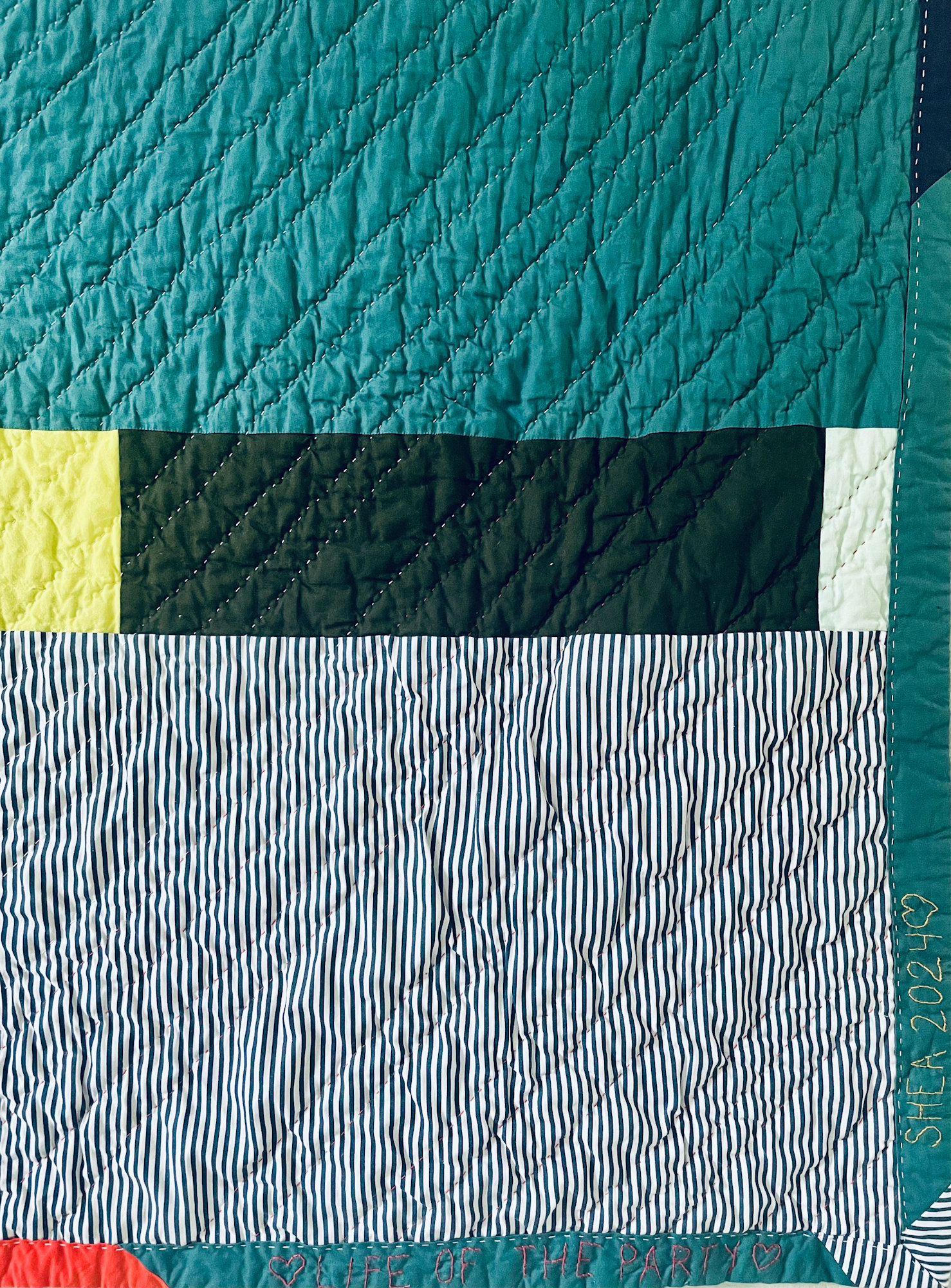 The front of this quilt was started when I took Tara Faughnan's Color Theory workshop and is based on her Bars Quilt pattern. However, like most quilts I make, I ended up liking the improvisationally pieced back the best and that's the side I usually have facing out on my bed.