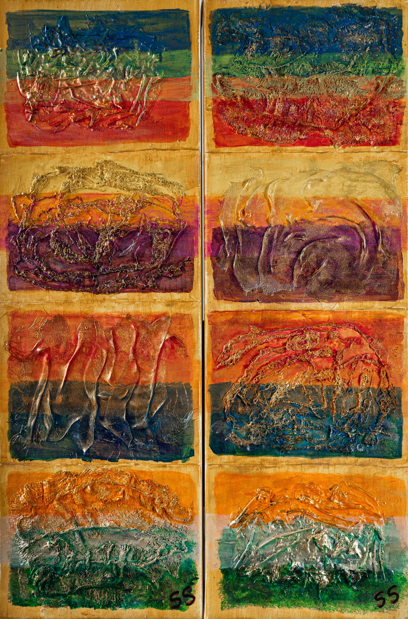 Texture and colour have attracted the artist for as long as she can remember. This piece is her joyful ode to the two things that characterise most of her pieces