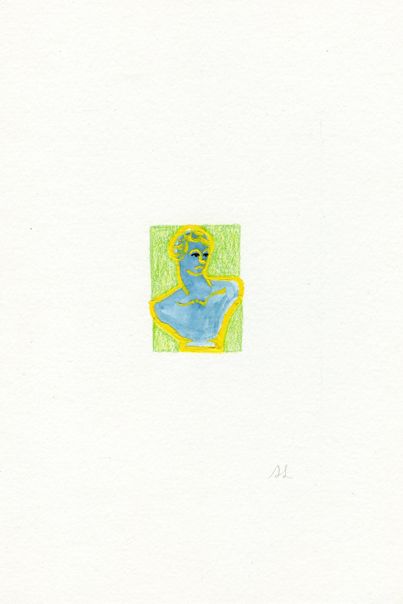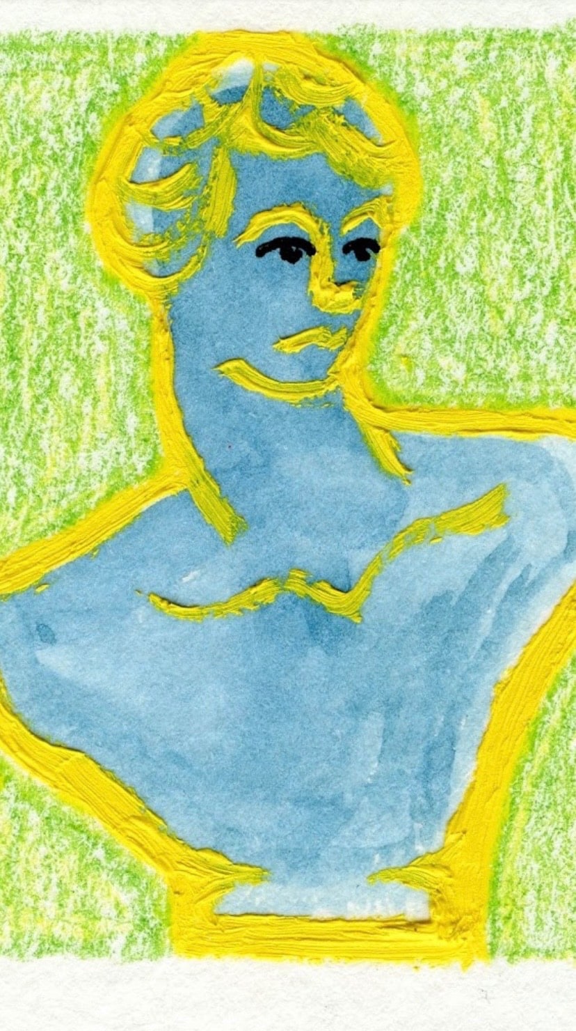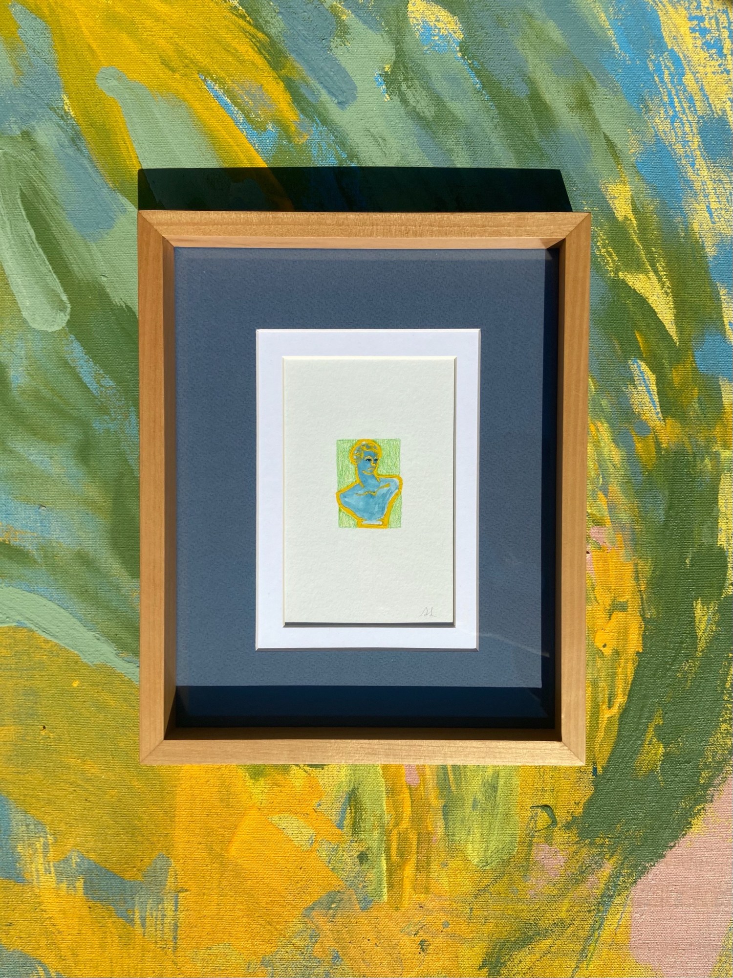Bored Young Prince is from a series of mixed-media pieces on watercolor paper that are inspired by art history, relics, and Greek mythology. Each small paper piece is framed and matted with the color matting that is pictured in a natural wood frame. The work on paper itself is 6"x4" and the total size of the piece including the frame is 11"x9".