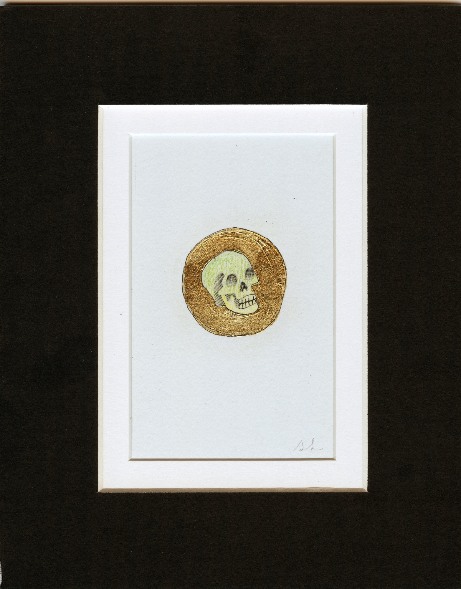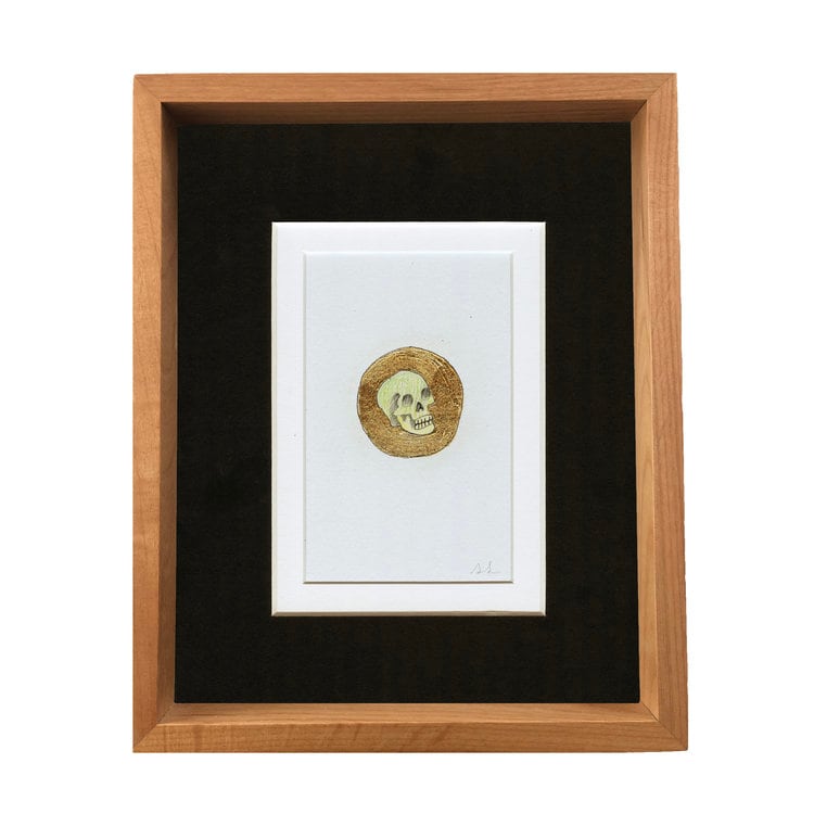 Pride of Spirit is from a series of mixed-media pieces on watercolor paper that are inspired by art history, relics, and Greek mythology. Each small paper piece is framed and matted with the color matting that is pictured in a natural wood frame. The work on paper itself is 6"x4" and the total size of the piece including the frame is 11"x9".