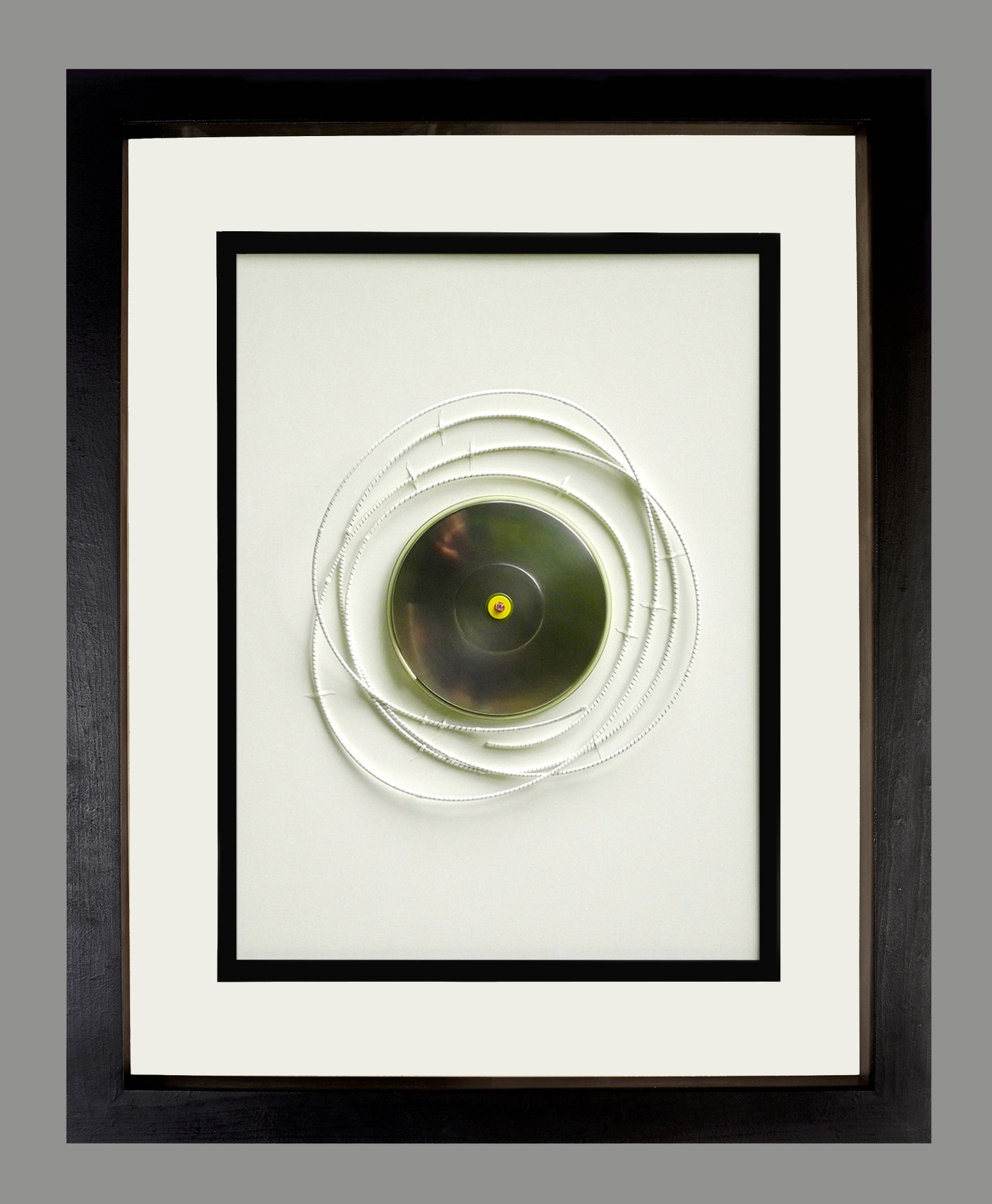 MessageA Walk Around features a reflective disc encircled by coiled wire wrapped with paper, forming a precise, meditative center. Light emanates from the small hole at its core, radiating outward and animating the surrounding paper field. The title evokes movement, yet the object remains still—inviting viewers to circle it with their gaze. The work balances industrial material with minimalist form, where repetition and containment speak to cycles of inquiry, memory, and return.