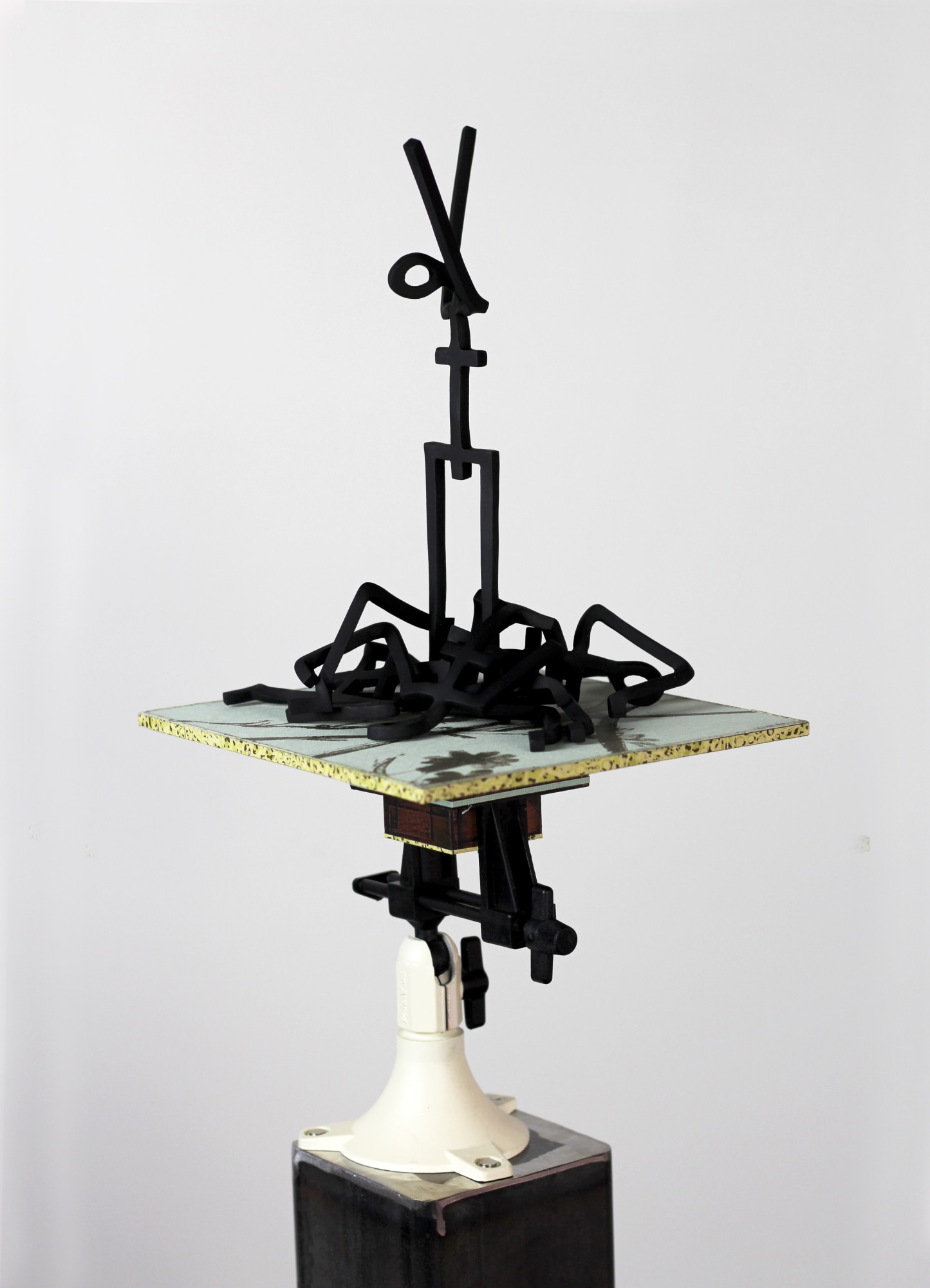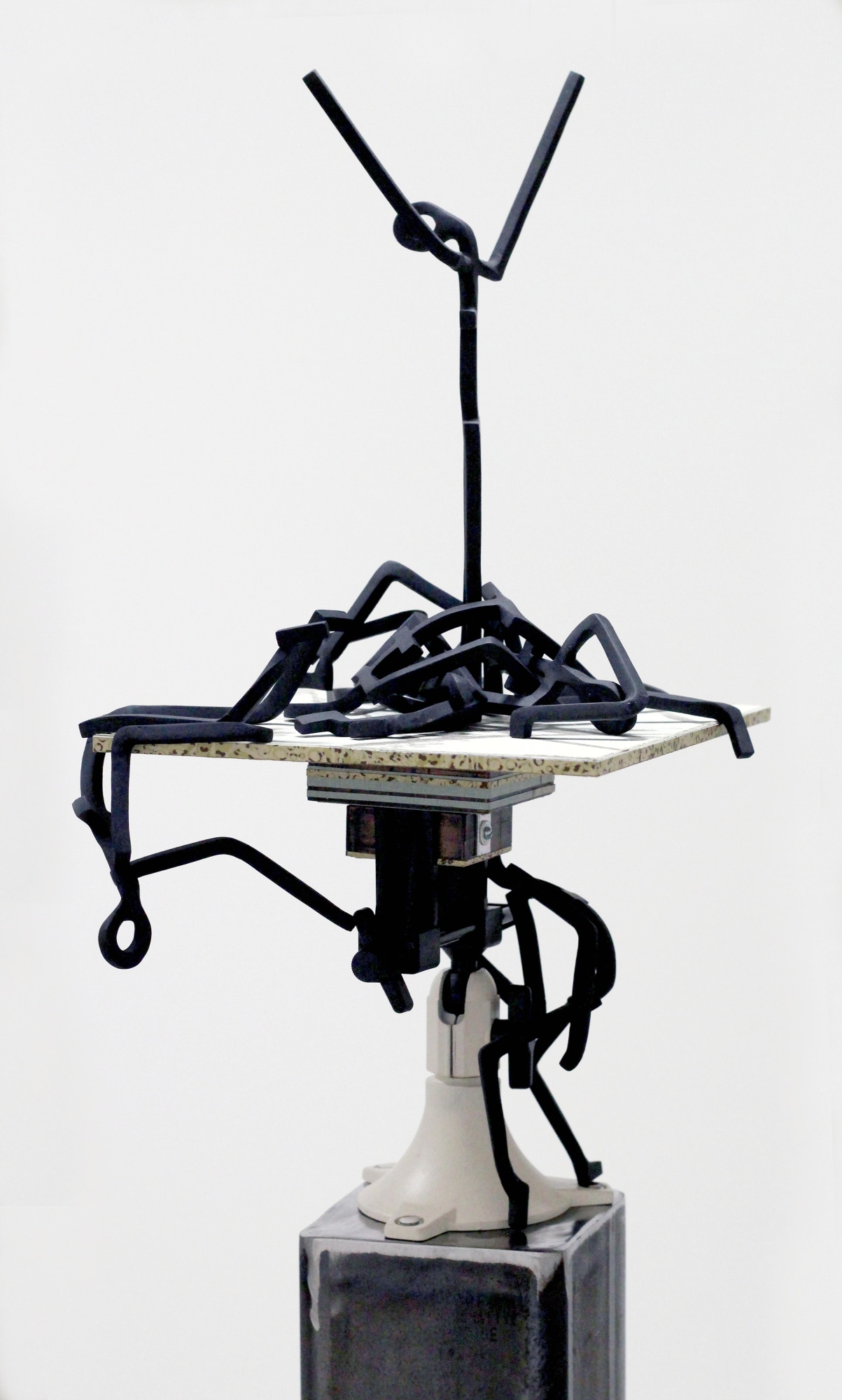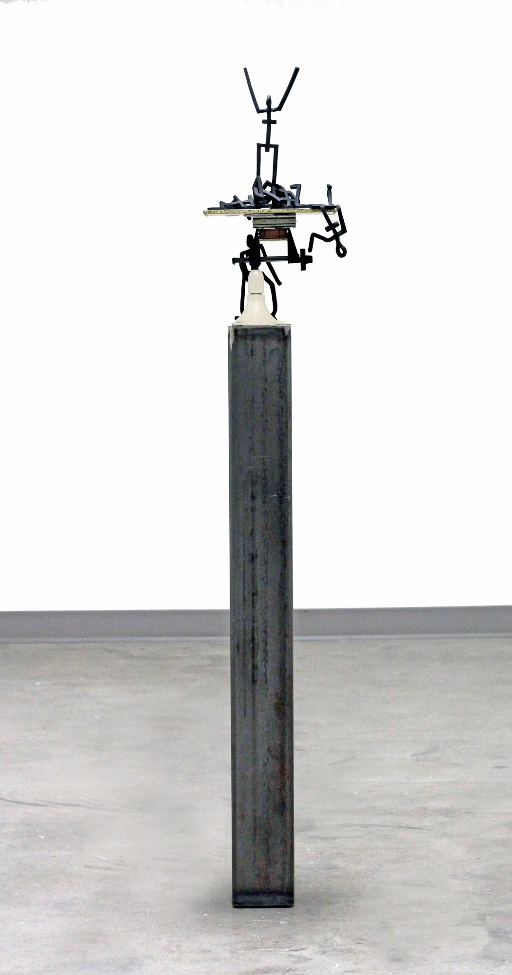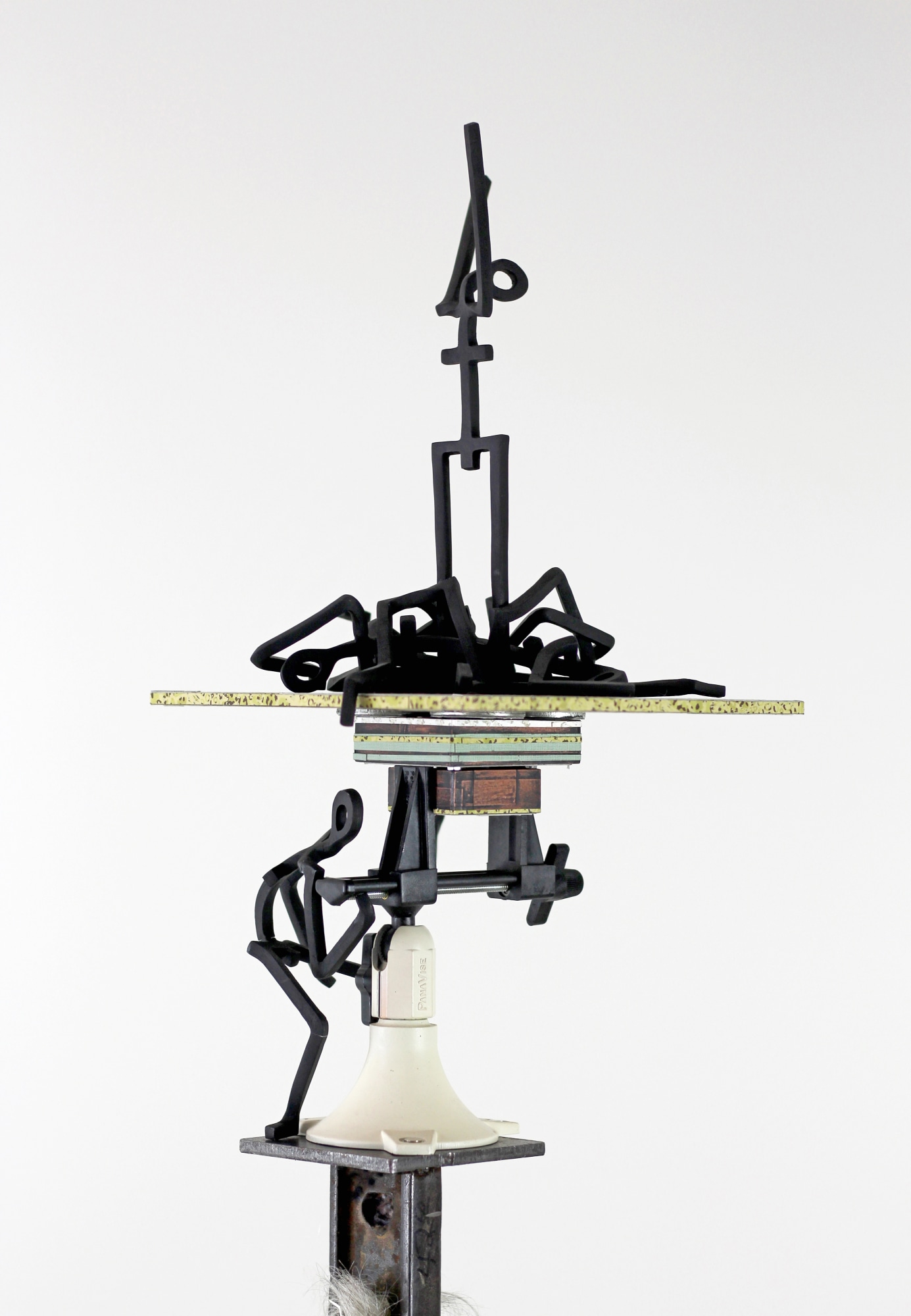 Un·ti·dy is a precarious construction of fragmented order, balancing linear steel figures atop layered, domestic materials. Steel—often coded as a “male material,” tied to industry, labor, and strength—collides here with wallpaper, with domesticity and decoration. The stacked, uneven composition resists neat categorization, echoing its definition: “not arranged neatly and in order.” The figures strain upward, climbing, reaching, or collapsing, suggesting how identities, relationships, and systems often resist containment, slipping beyond tidy boundaries.