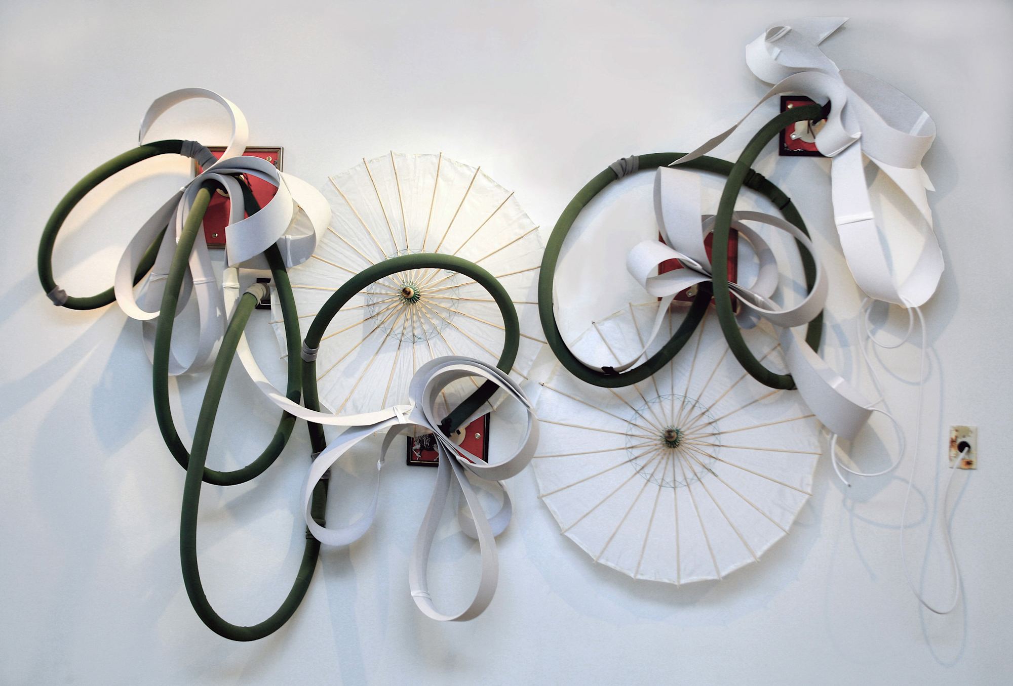 MessageHomage to WSPU (Women's Social and Political Union) transforms domestic and decorative materials—pipe insulation, vacuum hose covers, parasols, cords—into a sprawling, looping assemblage that recalls banners or ribbons of protest. The green and white palette echoes the historic suffragette colors, signaling resilience and the demand for rights. Yet the work resists tidy order; its knots and tangled curves suggest the messy, unfinished struggle for gender equality. This piece reclaims domestic objects, historically tied to women’s containment, as tools of defiance and solidarity