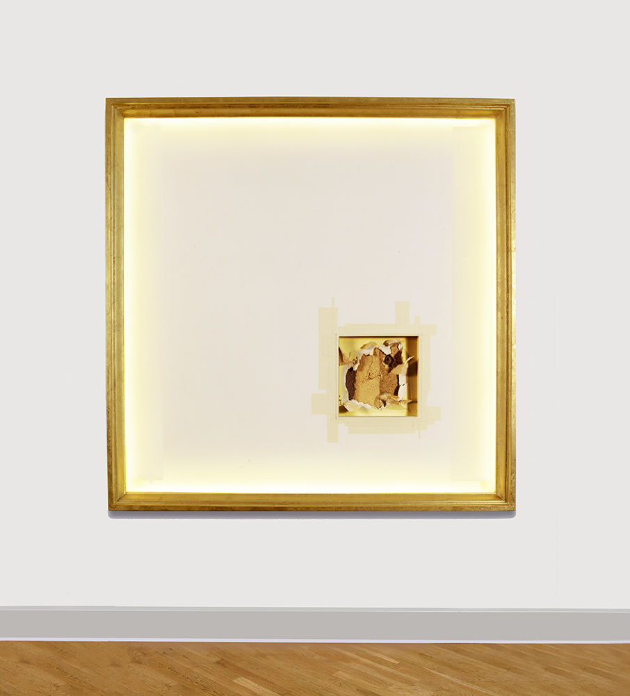 MessageRage, Rage against the Dying of the Light confronts the inevitable reality of dying and the quiet erosion of vitality. A gold frame suggests reverence, yet the illuminated rupture within reveals a visceral resistance. Torn, layered paper becomes both barrier and outcry. Light seeps through the damaged core—a fragile, flickering refusal to fade. Referencing Dylan Thomas’s poem, the work stages a minimalist protest against silence, loss, and the inevitability of death.