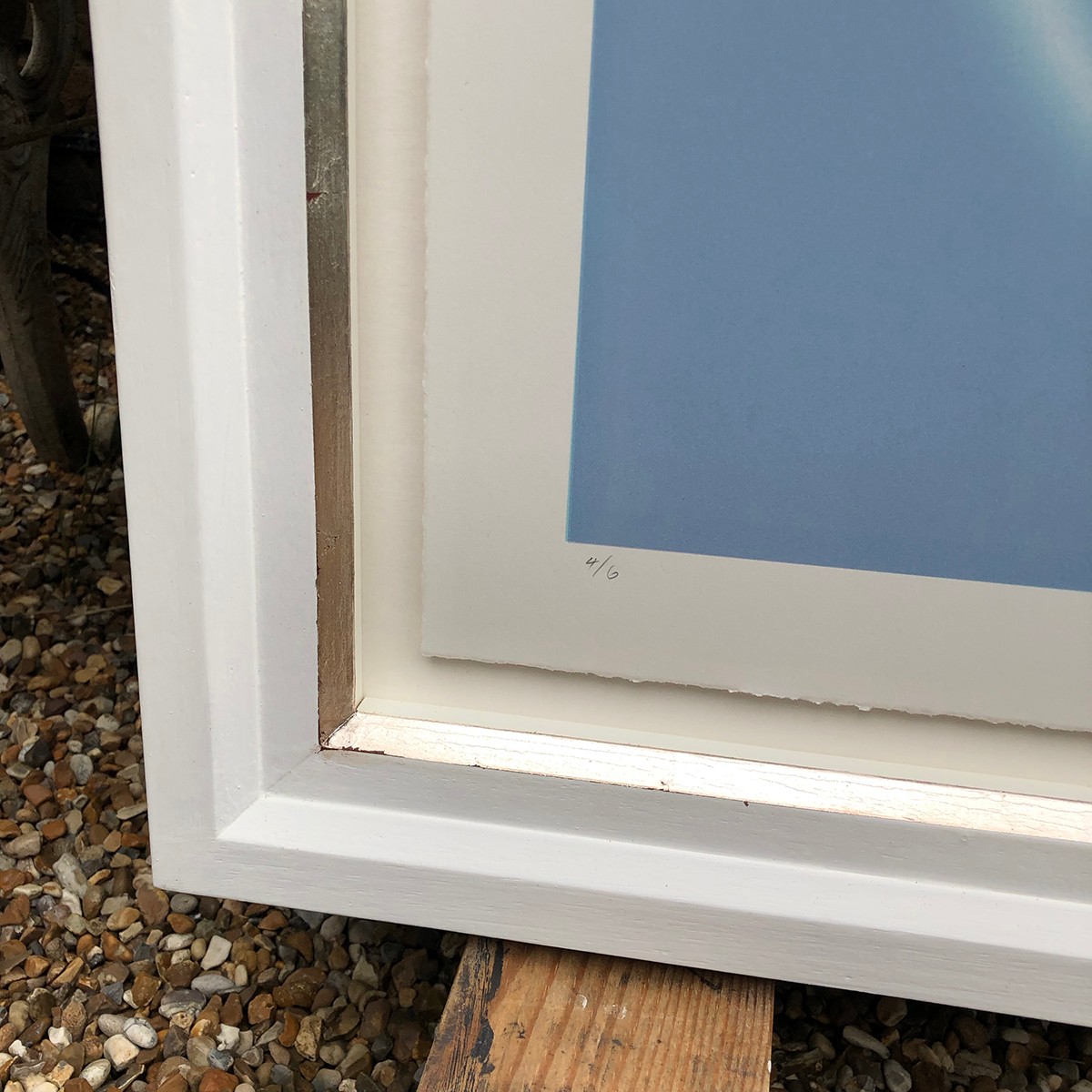 Framed in white timber frame with pure silver inlay