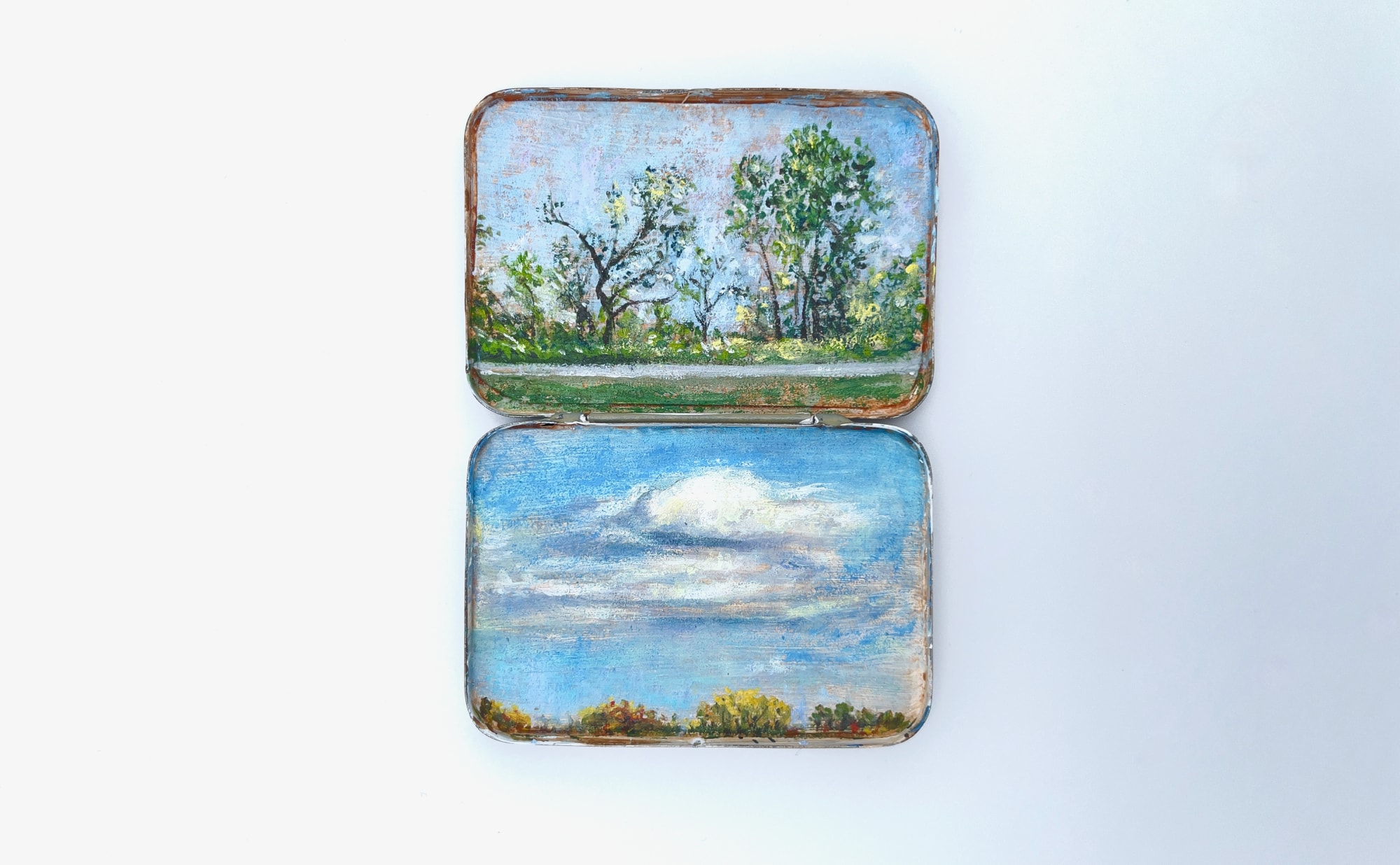 Oil landscape in tiny vintage medicine tin, to soothe and comfort the viewer.