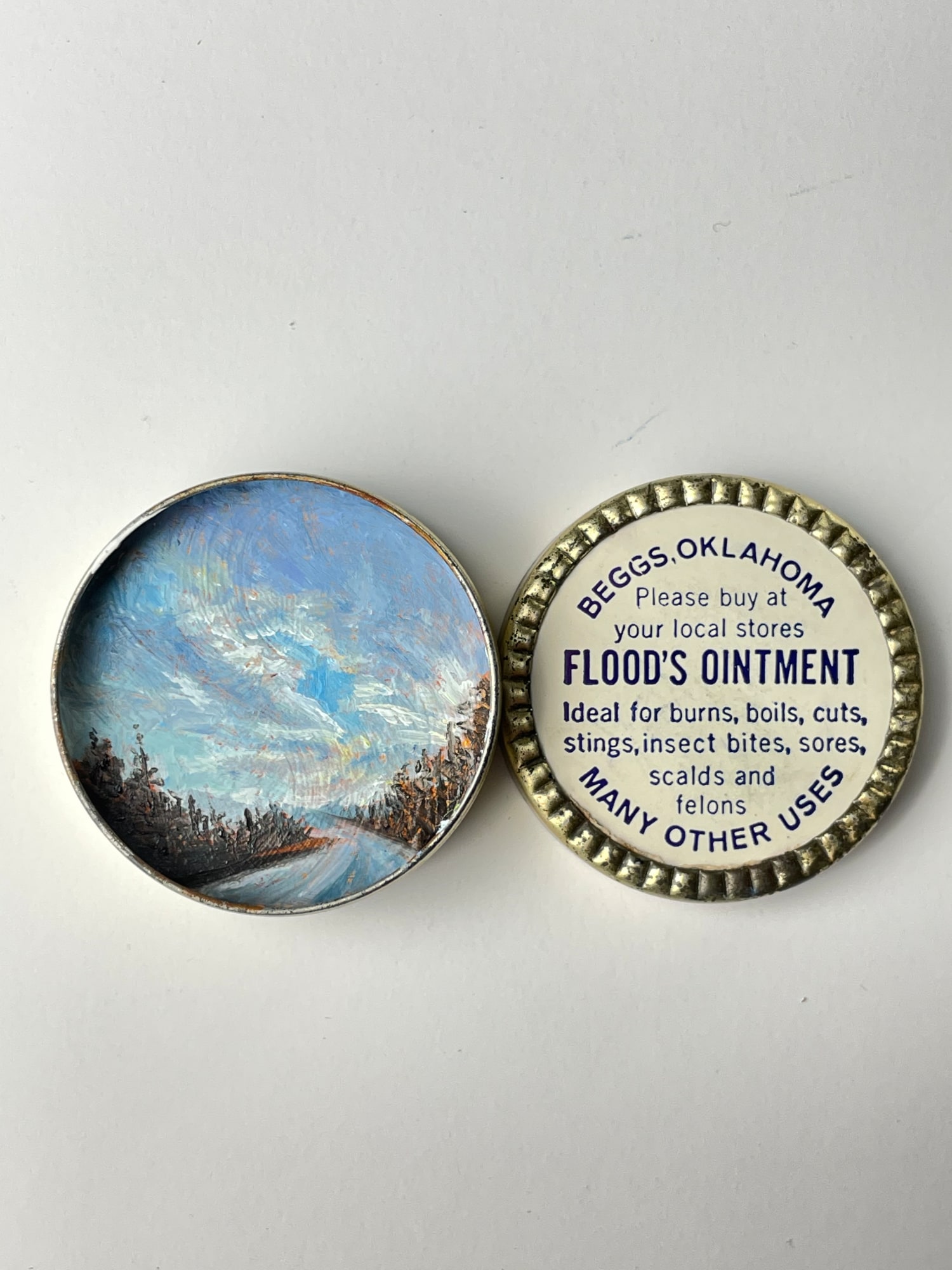 Tiny oil painting of a Vancouver Island mountain highway in a vintage Flood's Ointment tin, to soothe and comfort the viewer.