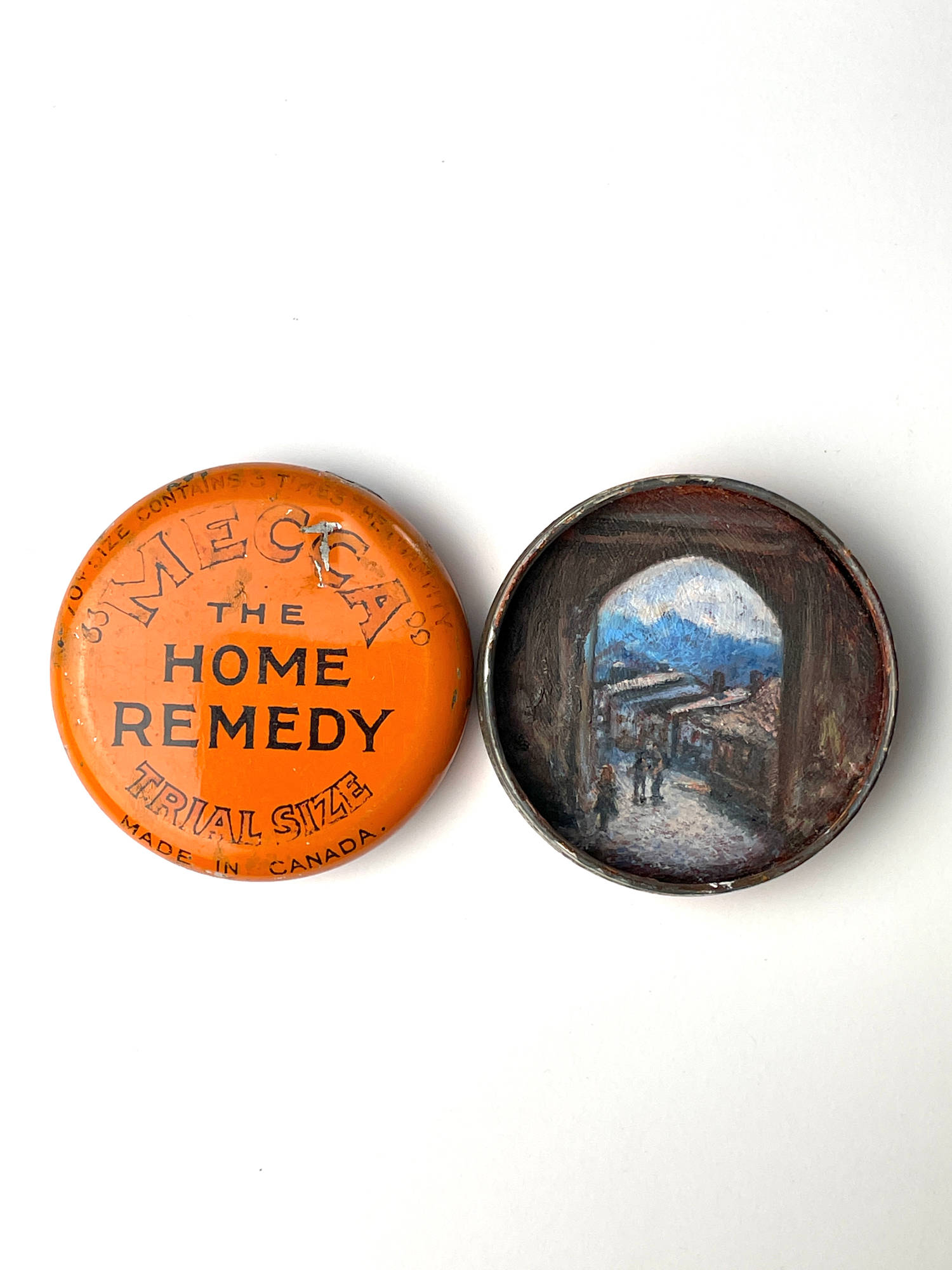 Tiny oil painting in vintage "Mecca the Home Remedy - Trial Size" medicine tin, to soothe and comfort the viewer.