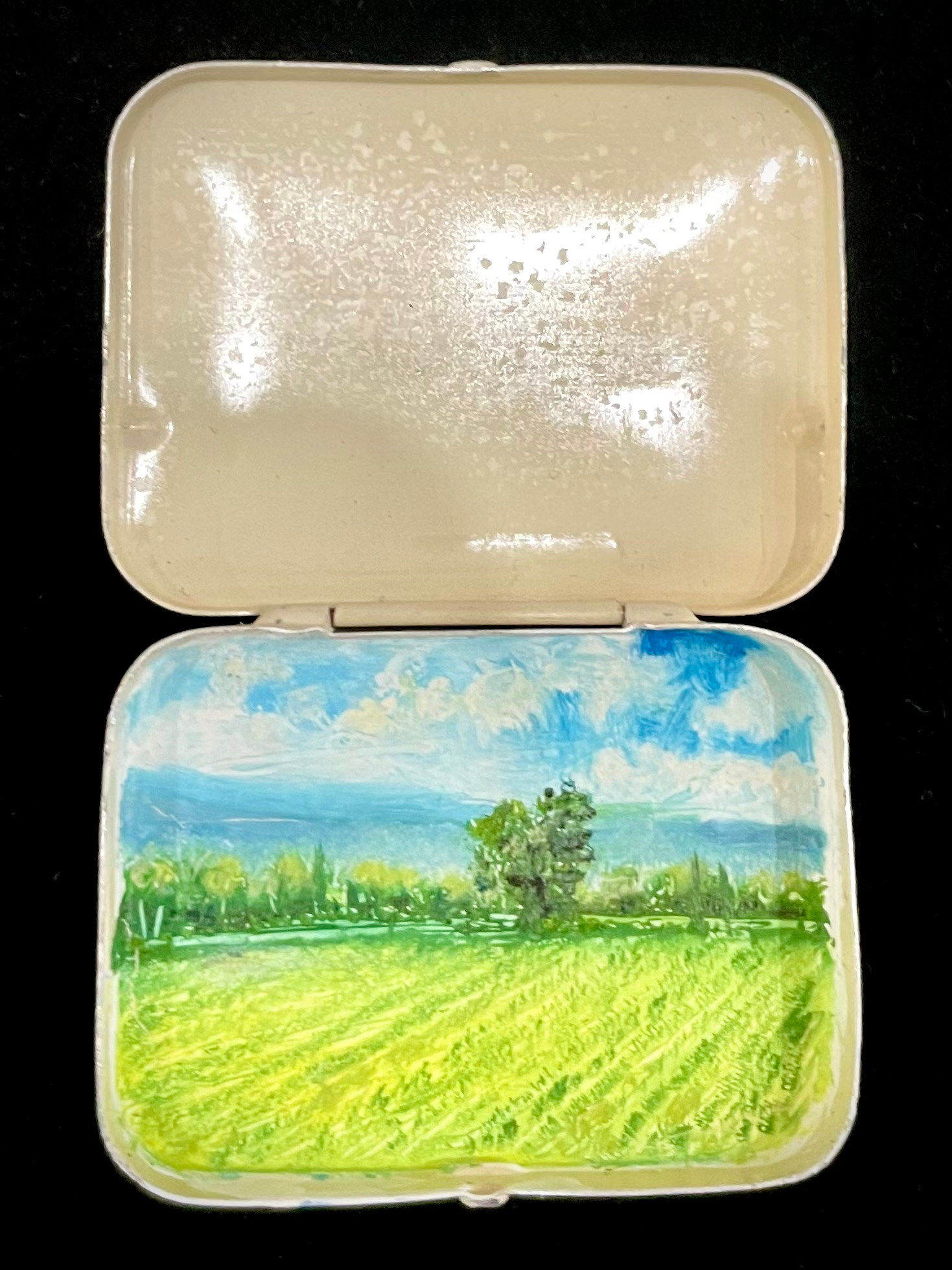 Tiny oil painting in vintage Soovain Aspirin tin of an Italian countryside farm and mountain range, to soothe and comfort the viewer.