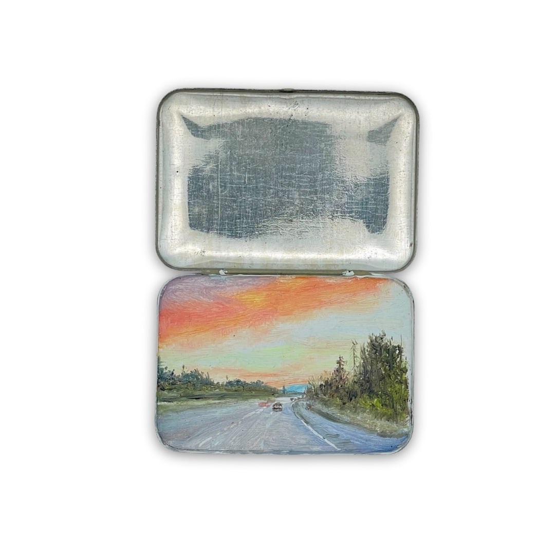 Oil landscape of a highway at sunset in tiny vintage medicine tin, to soothe and comfort the viewer.